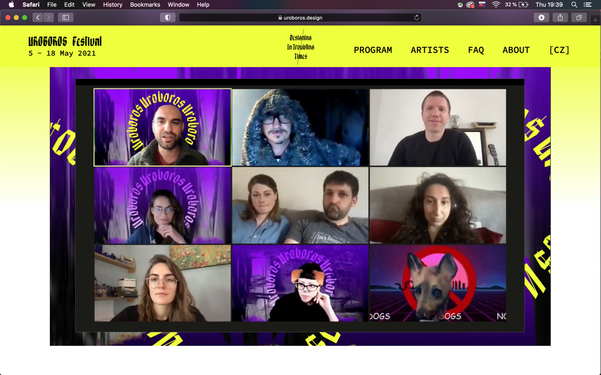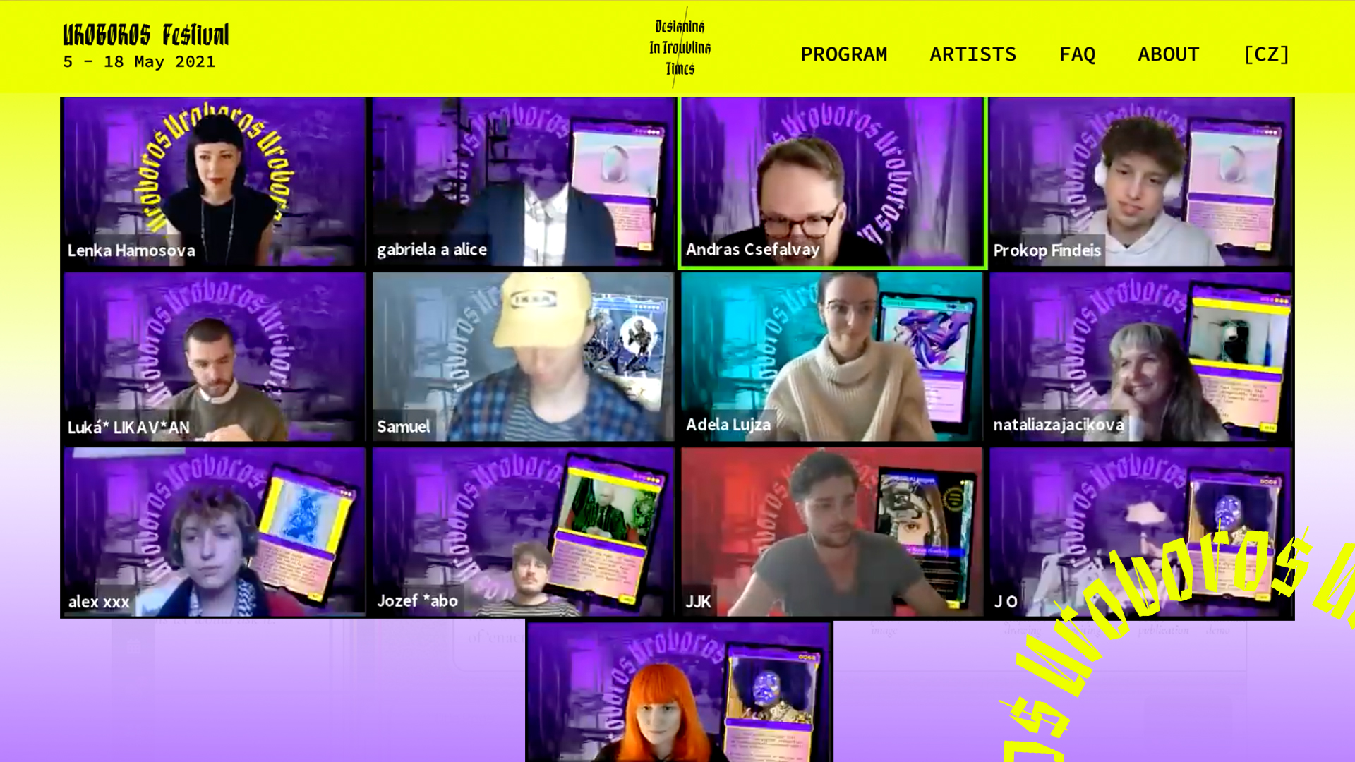 The Uroboros festival and community network provide an open, hybrid (online/offline) co-creative space for experimental explorations of the transformative potential of creative practice in art and design. In 2020 and 2021, the Uroboros project brought together over 1500 artists, designers, researchers, activists and enthusiasts interested in experimenting with plausible pathways to eco-social transformation, exploring topics such as the circular economy, multi-species collectivism, more-than-human care, sustainable cities, and social aspects of artificial intelligence. These areas of interest were brought to world-wide audiences through a plethora of co-creative events, including workshops, performative experiments, Live Action Role Plays (LARPs), and panel discussions. The Uroboros project was initiated in 2019 by a group of designers, researchers and curators based in Prague (CZ) and officially released in May 2020 along with the inaugural Uroboros festival. The first festival edition was organised mostly online (Covid-19 restrictions) and involved contributions from 43 artists and over 600 participants from across the world. Building on the success of the inaugural festival, the 2021 Uroboros edition offered an extended fourteen-day program of both online and face-to-face events that engaged a global pool of 1000 creative practitioners. Motivated by such outstanding interest in the festival and its leading theme Designing in Troubling Times, the Uroboros grew into a long-term project with community-building ambitions. This shift is supported by various collateral events and activities running throughout the year, including the Uroboros Bites series (https://uroboros.design/uroboros-bites/); exhibitions in the DOX gallery, Prague; an open-access festival archive of events (https://bit.ly/UroborosStream), a community mailing list and social media. This long-term community program is in its early stage and will be developed after securing necessary funding.
