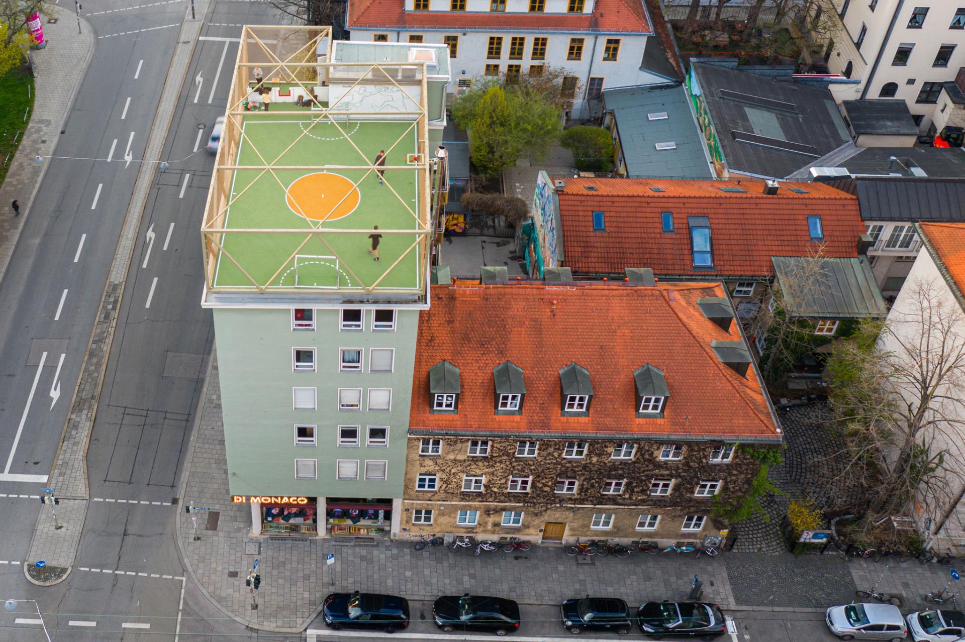 Since January 2019, the project receives subsidies from the City of Munich / Social Department as a pilot project within the framework of “ neighbourhood-related resident work ”. Many actors and people benefit from this. Users, refugees and volunteers were part of the development and renovation; refugees now find jobs/ and training in the Café as in the production of furniture and more. The Café is open to all and offers meals at pay-as-you-can within a certain price range. The small basement sports field would have been lost with demolition - against the petition of the responsible district councils. The new commerce-free sports field on top serves the whole neighbourhood in a district of Munich known for gentrification.