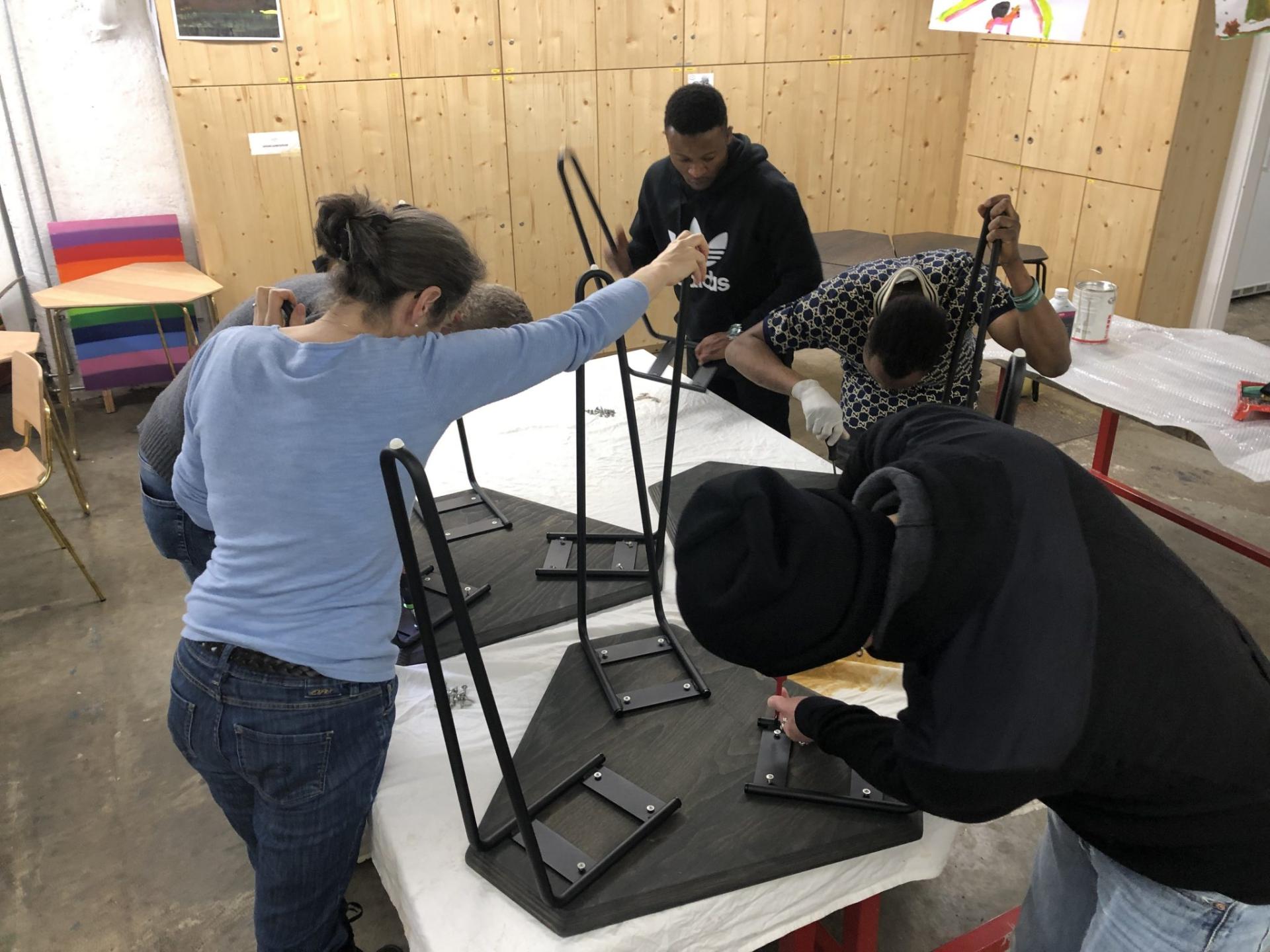Architects developed furniture for the Café with students and refugees which meet the requirements of a catering business while being cost-effective & attractive and, moreover, reflect the history of the residents and their refuge. The unique shape of tables picks up “communication” through its many possible combinations. High-quality furniture is produced together with refugees who are interested in handicrafts but have no special prior vocational training. Private sector provided advice from the initial idea through to market maturity. During regular workshops, the furniture is produced with individual motifs. It is available for free sale, 100% of the proceeds will go to Bellevue eG