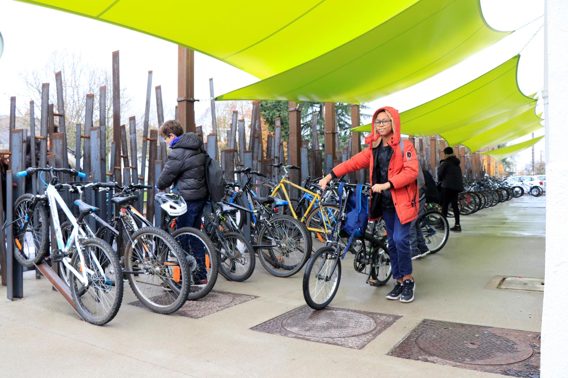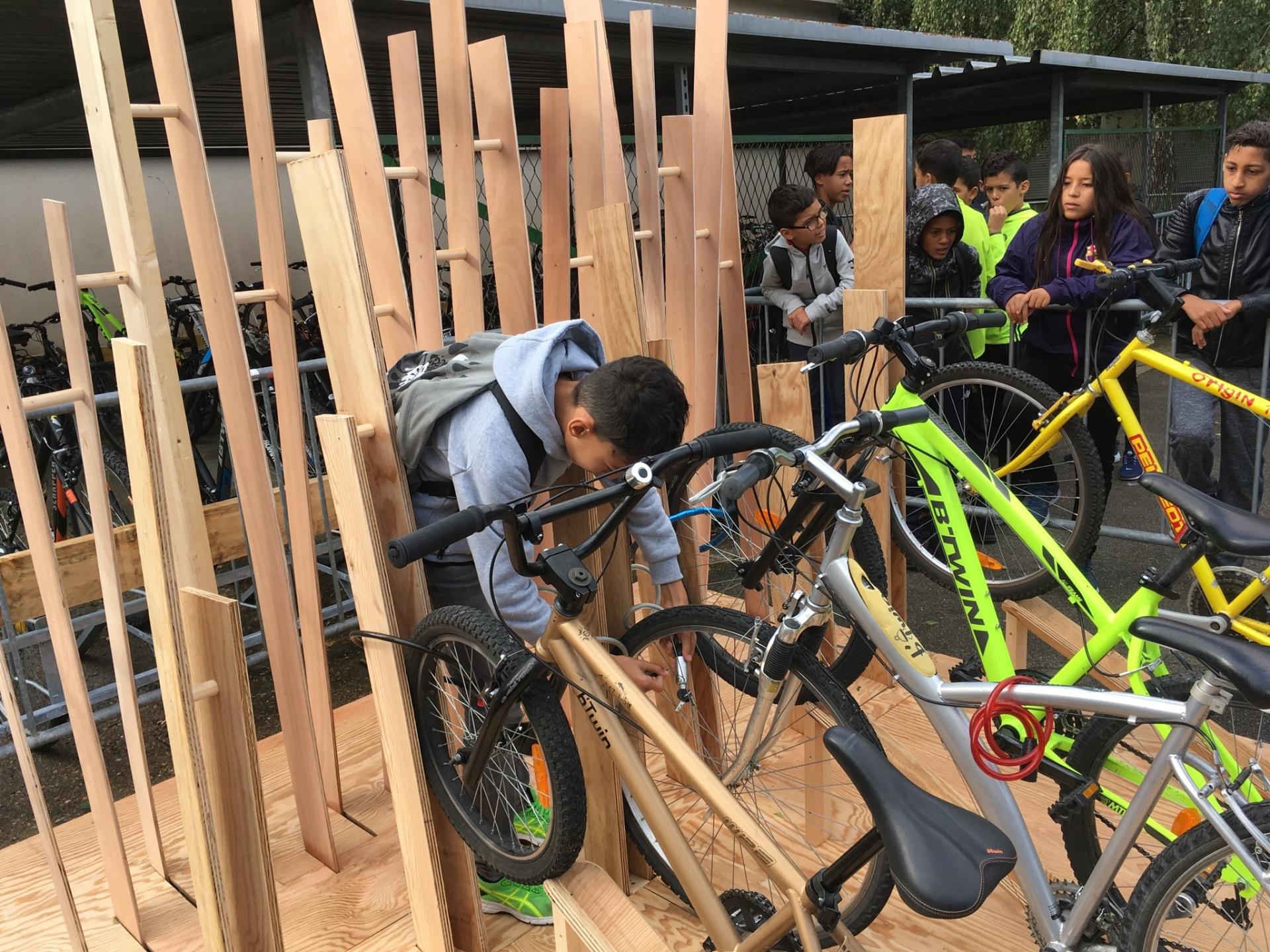 The project mobilised teachers in all subjects. The renovation of the bicycle garage is certainly one of the best examples. The formal work was carried out in collaboration with a maths teacher who, in a geometry class, identified the perfect balancing position for a bike wheel. With his pupils, the technology teacher studied the issue of forces (traction, compression, tension), to illustrate the solidity of the work and to reassure on the protection of the bikes. The history teacher explored the town’s railway past in order to understand the choice of steel, while his chemistry colleague took the opportunity to study corrosion and reassure the pupils on the durability of the work. Finally, the art teacher was involved by introducing the pupils to contemporary sculpture (Richard Serra in particular).