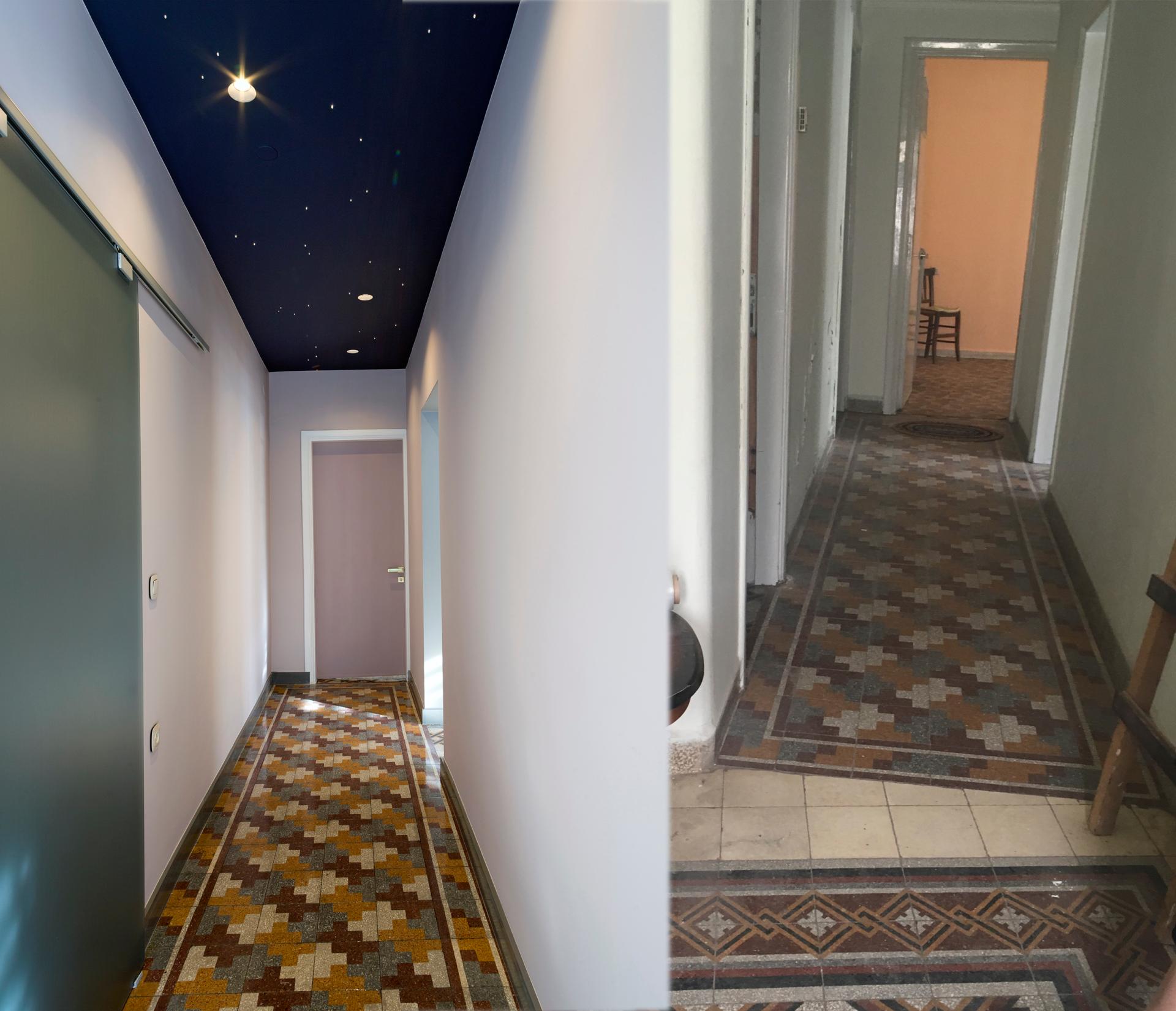 The building located the housing needs of a family until the early 00’s when it was abandoned. The initial condition was that of a fully-furnished place with the function paused in the aesthetics of 60’s era. All the furnishing and even the smell of the clothes of someone else’s life became a subconscious guide to respect and enlighten the story of the building itself. Furthermore, as the structure consisted of load-bearing walls and demolitions were limited the reuse of materials (brick and stone) and furniture upcycling had to mainly adjust on site data. At the same time the program of a modern clinic was perplex and it should ensure modern protocols. The final plan the 115sq.m. clinic consisted of two reception areas, one nursing room serving breastfeeding mothers, a reception hall, the doctor’s room, an adult bathroom, a children's bathroom and the doctor’s personal bathroom.