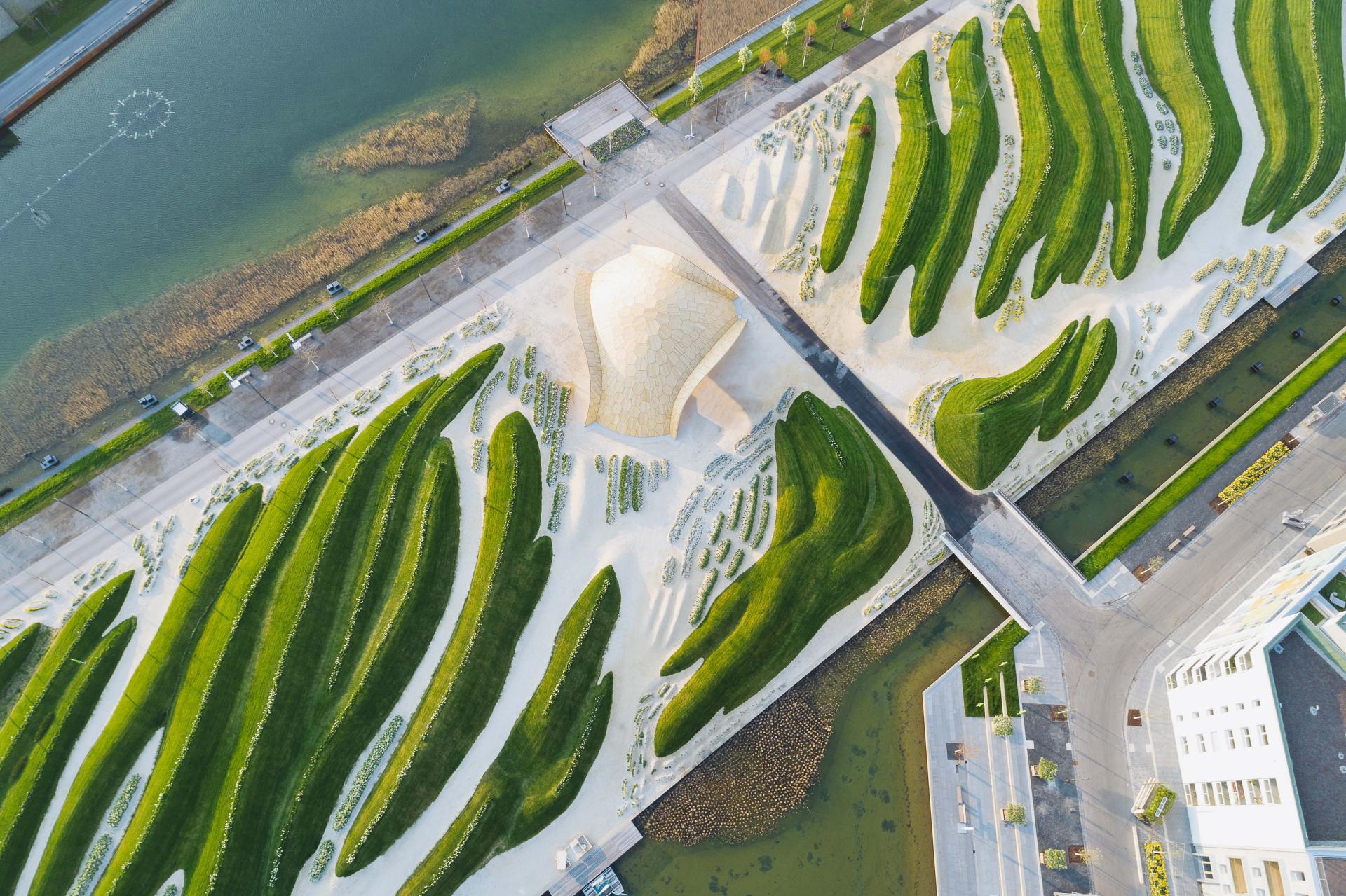 The BUGA Wood Pavilion is located at a central crossroad within the wavy landscape of the BUGA summer island. Three dynamic arches form inviting openings in the main directions and guide visitors into the pavilion’s interior. Hosting concerts and public events, the shell creates a smoothly-curved space that provides exceptional acoustics and generates a unique architectural atmosphere. This is especially true at night, when thousands of LED lights embedded in the shells inner openings light up and bathe the pavilion’s interior in subtle, warm and welcoming light. During the months from April to October 2019 more than 2 million visitors from all over germany and its neighbour countries were visiting the BUGA - with the project's segmented wood shell structure as one of the main attractions. The pavilion's space provided a special environment for a multitude of events: from theater, music and religious celebrations to communal meetings and exhibitions - it's schedule was tightly packed.