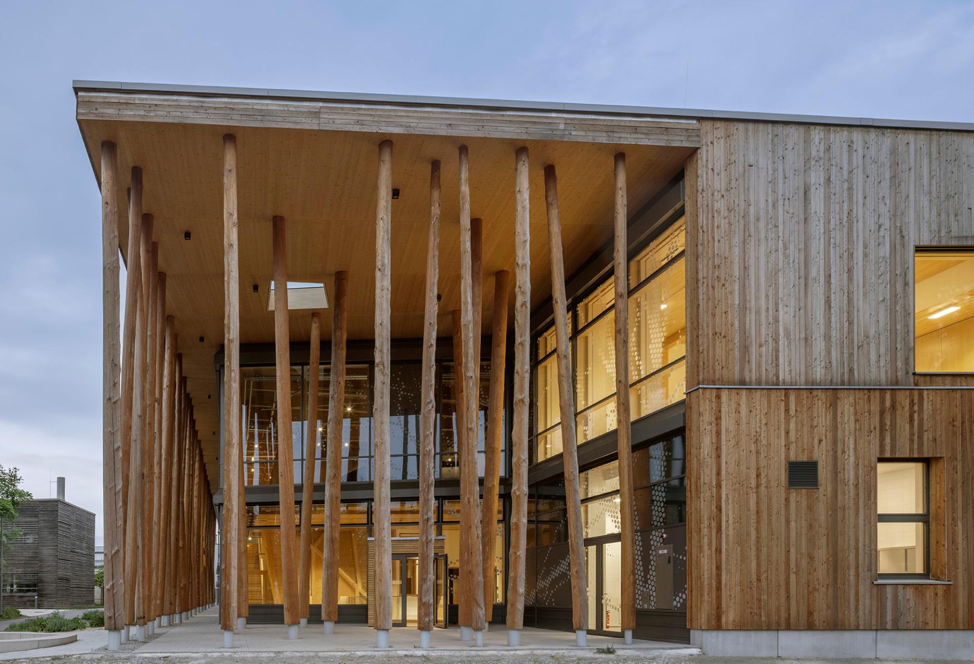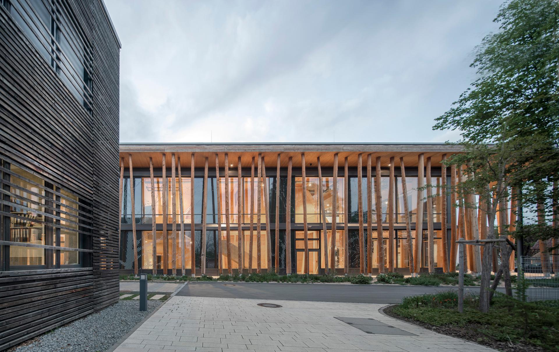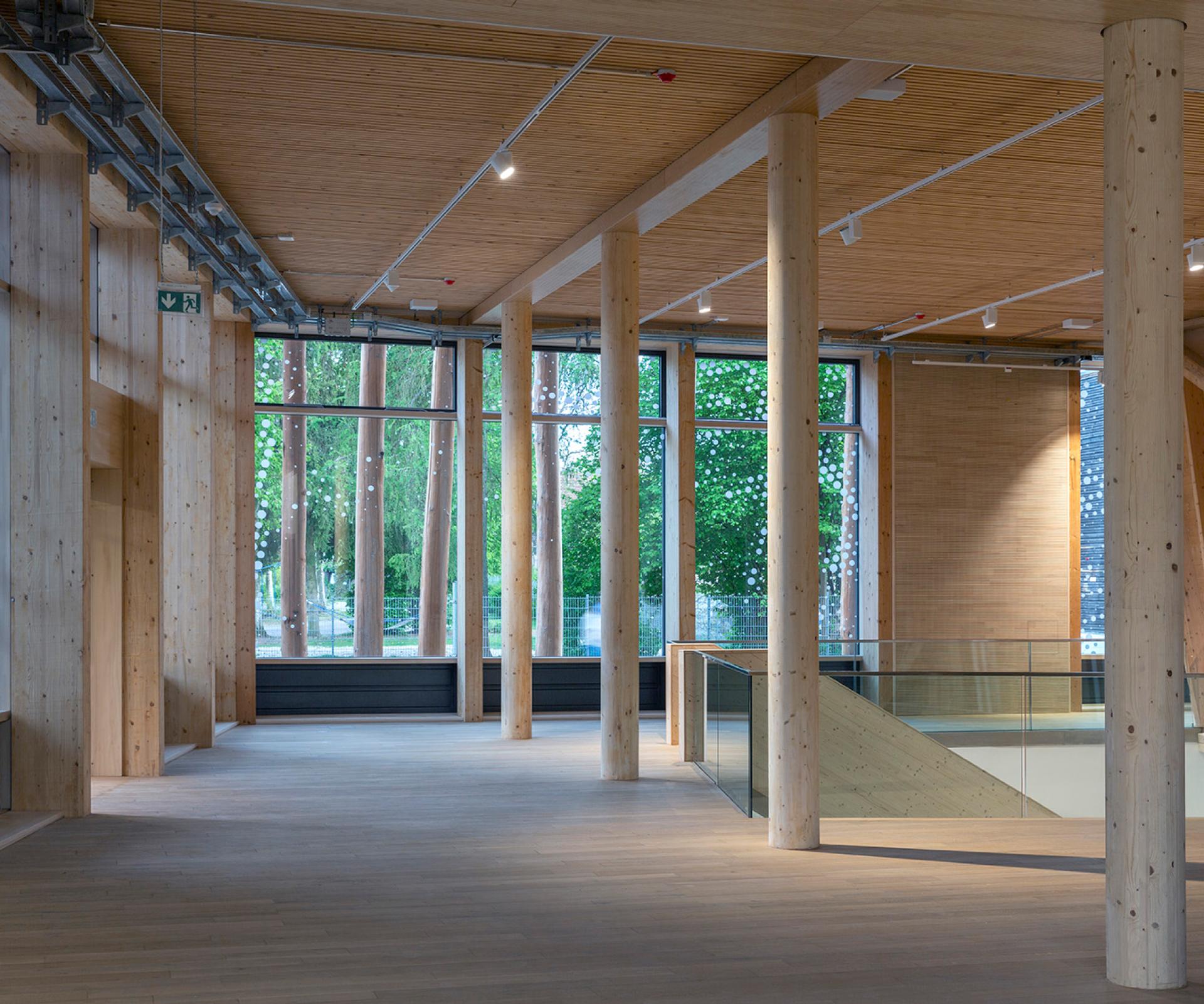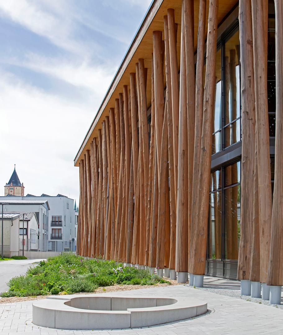 visitors can get information comprehensively and vividly about the future topics renewable raw materials and energies. The new building is in its complete construction and technology itself an exhibit and as well part of the exhibition and largely constructed of wood: load-bearing outer walls, a roof structure made of ribbed wood panels, columns made of glued wood, inner walls and stairs made of cross-laminated timber and one of stacked boards constructed wood concrete ceiling, which underneath is constructed as a wood acoustic ceiling, are the dominant materials. A special essential design element of the NAWAREUM’s south facade is one composition of free-standing trees that create associations with a silvan glade of the Bavarian Forest in Straubing’s direct environment and strengths the special character and purpose of the exhibition building, visible for everyone to the outside world.