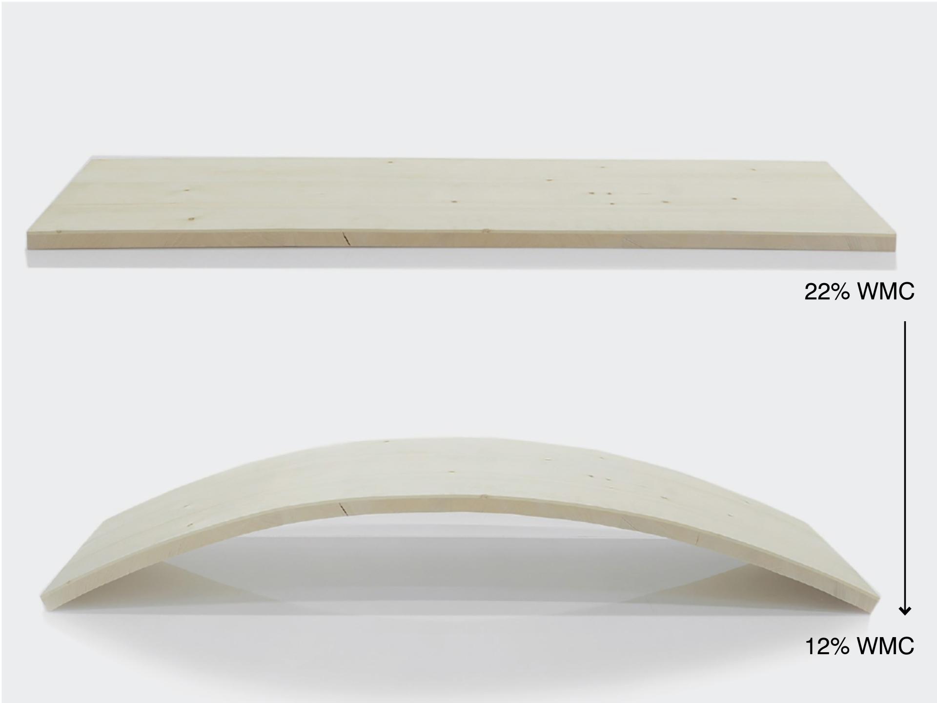 In timber construction, moisture typically causes problems with cracking and deformation; hence, moisture changes and stress development must be carefully controlled. In contrast, in this project wood is programed and arranged in a way to utilize this powerful, naturally occurring deformation to trigger a designed self-shaping behavior. In the same way that machines can be programmed to perform different movements, wood parts can be programmed to transform into predetermined shapes when dried. While methods of bending wood into different shapes for structure and aesthetics have existed for centuries and have become recognized industrial processes, they still mostly rely on brute mechanical force for the shaping process. Similarly, an understanding of how wood deforms due to changes in moisture content is well known in practice and academics. However, a shift in design thinking, as well as new computational simulations for more accurate prediction, now allow us to use this moisture induced swelling and shrinking to design and program specific self-shaping movements at larger and larger scale.
