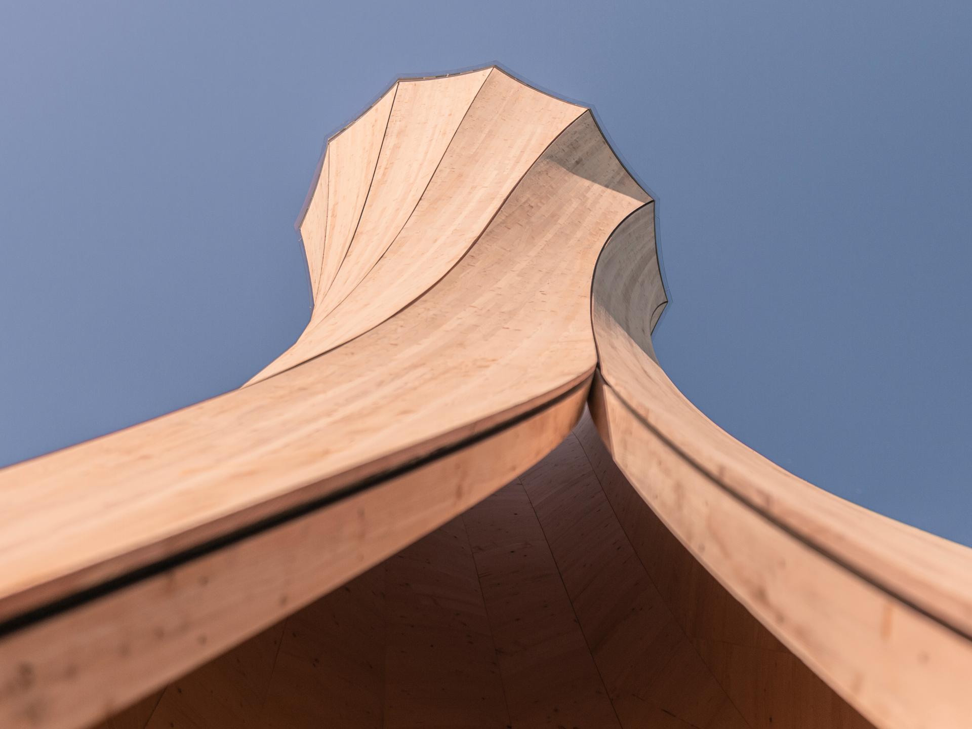 The Urbach Tower is a unique wood structure. The design of the tower emerges from a new self-shaping process of the curved wood components. This pioneering development constitutes a paradigm shift in timber manufacturing from elaborate and energy-intensive mechanical forming processes that require heavy machinery to a process where the material shapes entirely by itself This shape change is driven only by the wood’s characteristic shrinking during a decrease of moisture.