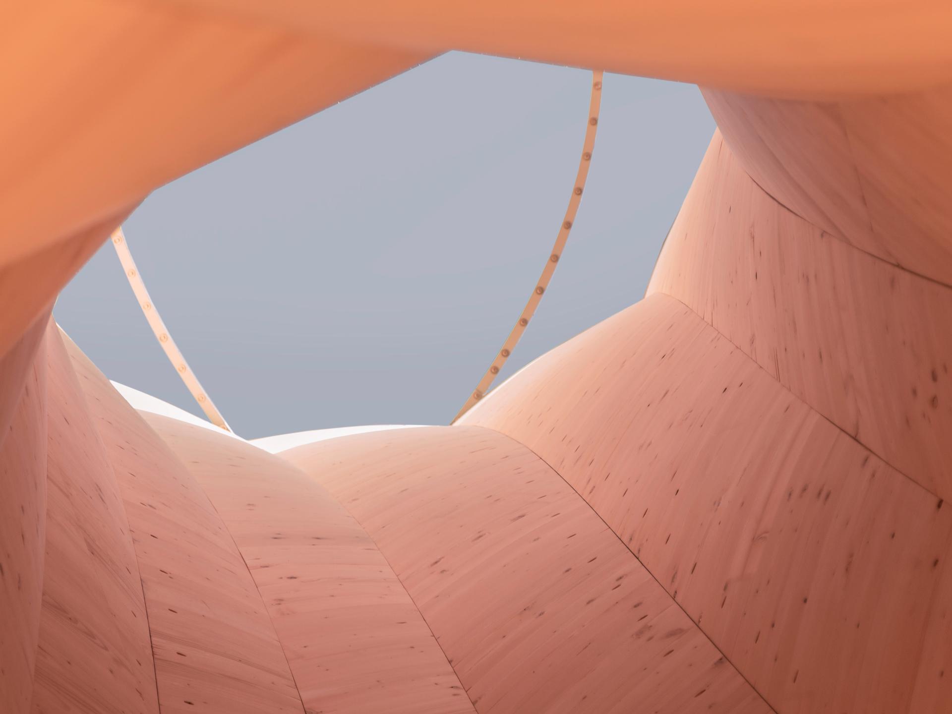 The pioneering development of large-scale self-shaping constitutes a paradigm shift in timber manufacturing from elaborate and energy-intensive mechanical forming processes that require heavy machinery to a process where the material shapes entirely by itself. This shape change is only driven by the wood’s characteristic shrinking during a decrease of moisture content. The curved Cross Laminated Timber (CLT) components for the tower’s structure are designed and produced as flat panels that deform autonomously into predicted curved shapes when dried. The 5.0 m x 1.2 m spruce wood bilayers parts are manufactured with a high wood moisture content and specific layups and dried in an industry standard technical drying process. When removed from the drying chamber the parts are precisely curved. The parts are overlapped and laminated together to lock the geometry in place, forming larger curved CLT components with form stable geometry. Material specific computational mechanics models have been developed to both design, predict, and optimize the material arrangement required to produce different curvature types and radius. The technology of self-shaping manufacturing for solid timber boards and the rapid adaptability of the process to different curvatures open up new and unexpected architectural possibilities for thin shell wood structures, using a sustainable, renewable, and locally sourced building material. The Urbach Tower is the very first implementation of this technology on building-scale, load-bearing timber parts.