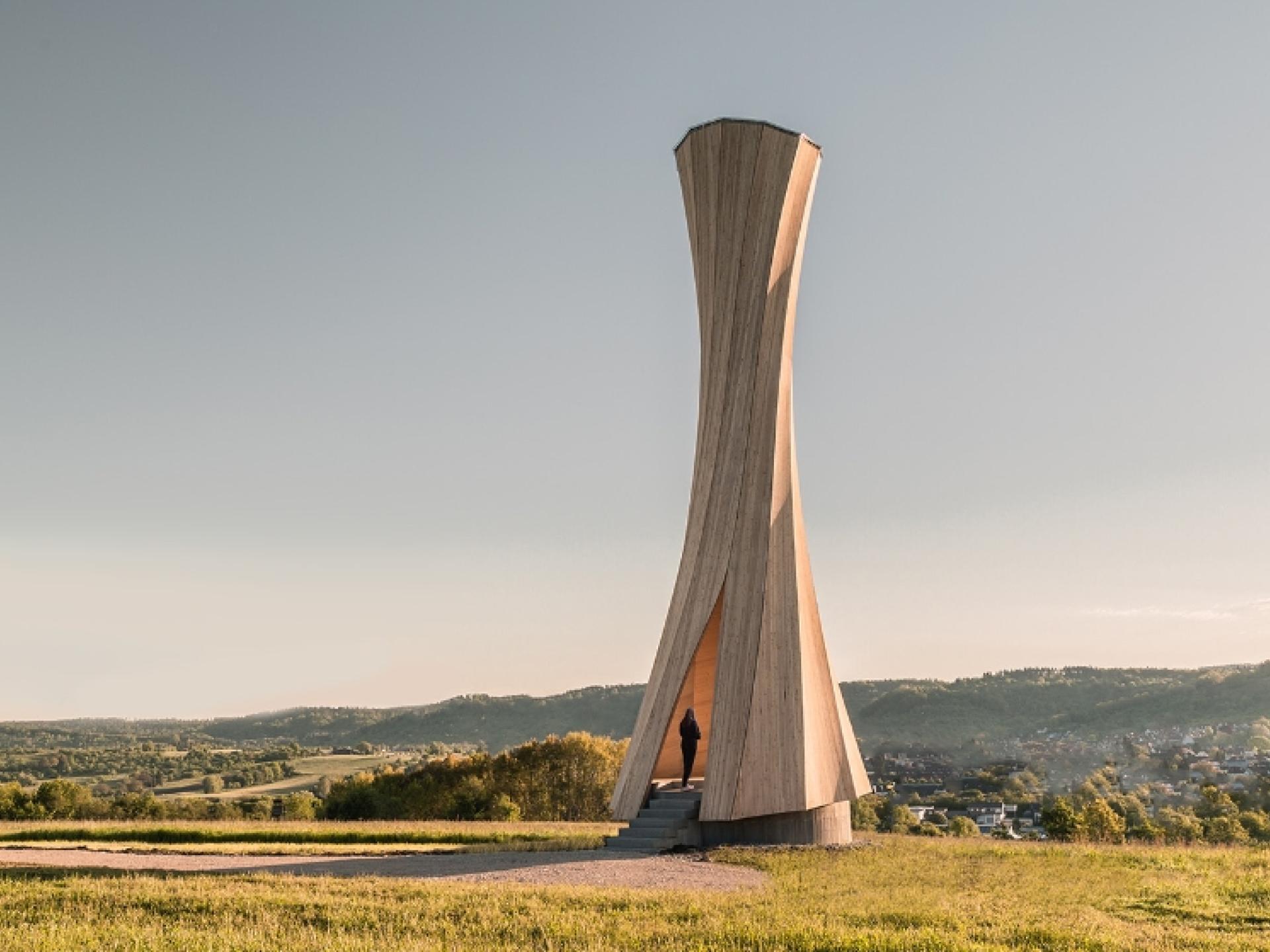 The Urbach Tower is one of 16 stations designed by some of the most renowned German architects for the Remstal Gartenschau 2019. The stations are small, permanent buildings that evoke the traditional white chapels distributed in the fields and vineyards along the scenic Rems Valley. Located on a prominent hillside in the center of the valley, the 14 m tall tower is a striking landmark that visually connects several stations. It provides a place of shelter, internal reflection and outward view by revealing stunning vistas and framing the landscape. The distinctive form of the tower constitutes a truly contemporary architectural expression of the traditional construction material wood. It celebrates the innate and natural characteristics of self-shaped wood in its upwards spiraling shape. The concave curvature of the structure on the outside results in sharp lines and crisp surfaces, which is further accentuated by direct day light and whitening of the larch cladding over time. In contrast, on the interior the convex curvature creates an unexpected visual and tactile material experience, with the timber structure appearing to be almost soft and textile-like, highlighted by the light washing the gently undulating surfaces. Opposite the entrance, the thin wood envelope opens like curtain, putting the Rems Valley on center stage.