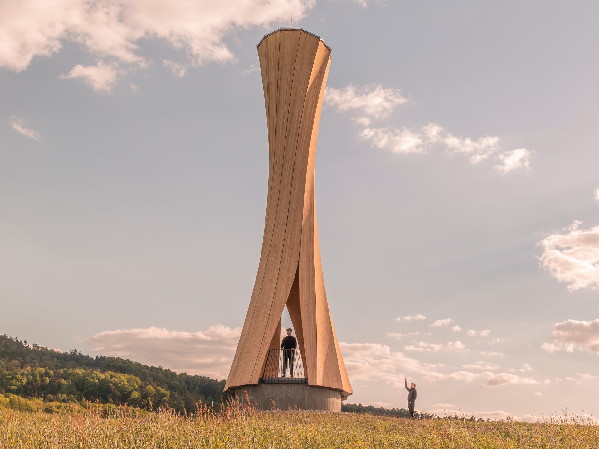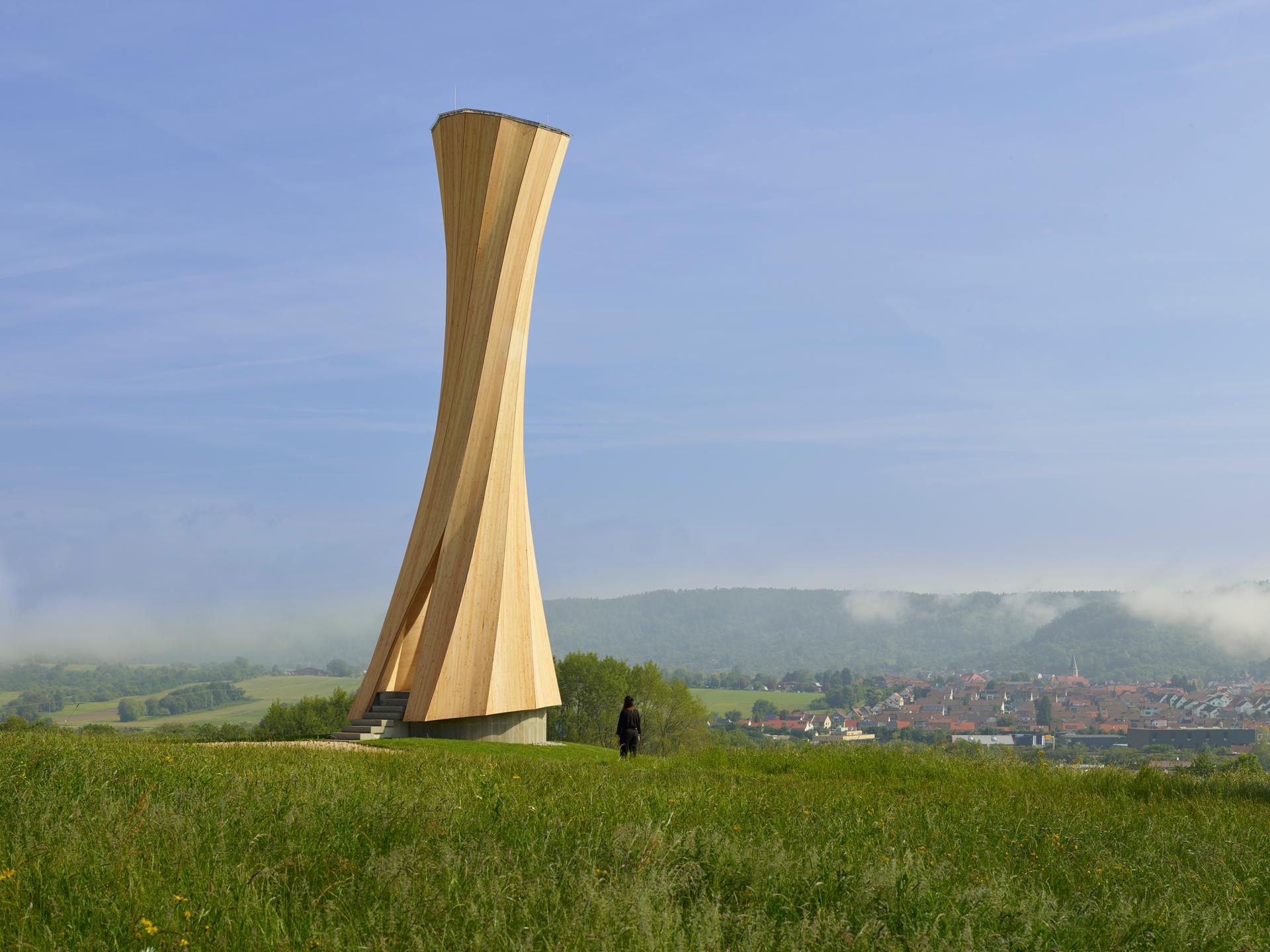 The Urbach Tower is a unique landmark built from self-shaping wood for the Remstal Gartenschau 2019 in Urbach, Germany. The design of the tower emerges from a new self-shaping process of the curved wood components. This pioneering development constitutes a paradigm shift in timber manufacturing from elaborate and energy-intensive mechanical forming processes that require heavy machinery to a process where the material shapes entirely by itself. This shape change is driven only by the wood’s characteristic shrinking during a decrease of moisture content. Components for the 14 m tall tower are designed and manufactured in a flat state and transform autonomously into the final, programmed curved shapes during industry-standard technical drying. This opens up new and unexpected architectural possibilities for high performance and elegant structures, using a sustainable, renewable, and locally sourced building material. The Urbach Tower constitutes the very first structure worldwide made from self-shaped, building-scale components. It not only showcases this innovative manufacturing approach and resultant novel timber structure; it also intensifies the visitors’ spatial involvement and landscape experience by providing a striking landmark building for the City of Urbach’s contribution to the Remstal Gartenschau 2019.