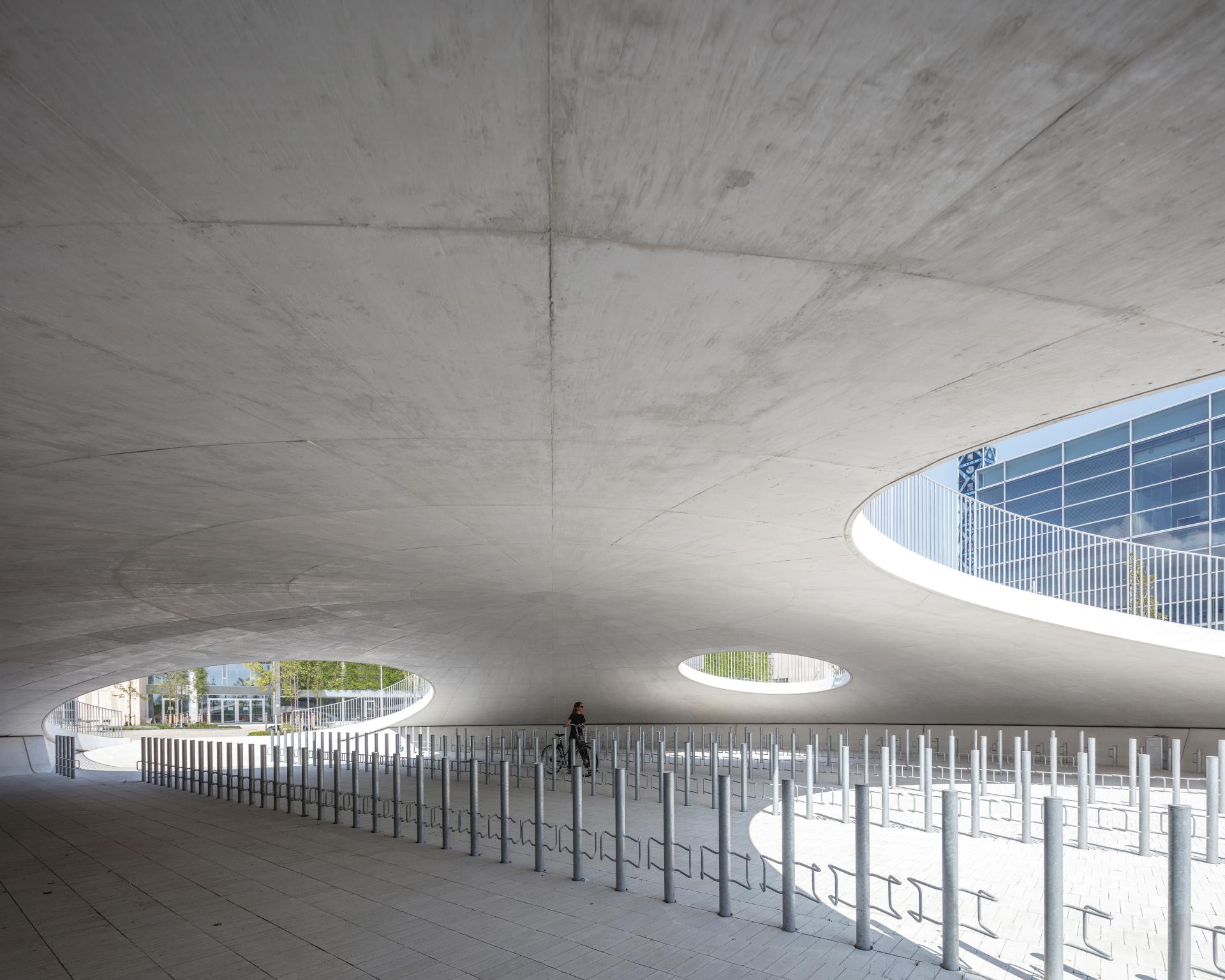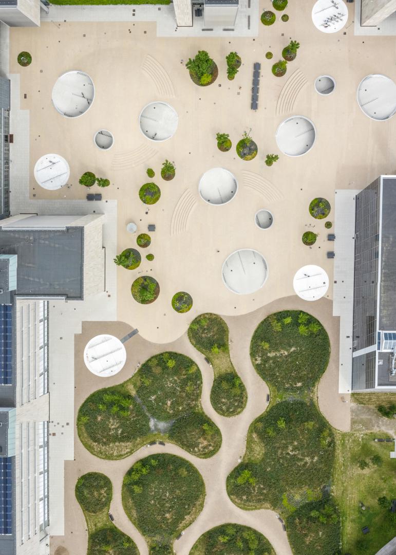 The bicycle hills are created as concrete domes with a shell construction as the load-bearing structure. The materiality of the surrounding buildings is predominantly defined by travertine façade claddings and green elements such as hanging gardens. Inspired by its surroundings, the design of Karen Blixens Plads puts emphasis on choosing mainly simple and durable materials. Tiles are used as the main surface material, echoing the colors of the surrounding buildings and creating a coherent identity for the campus area. The materials are all long-lasting with a low maintenance cycle, and easily recyclable. The cathedral-like bicycle hills are an aesthetic experience in itself – both when parking your bike and gathering on the hills for lectures, group work, or other social events.
