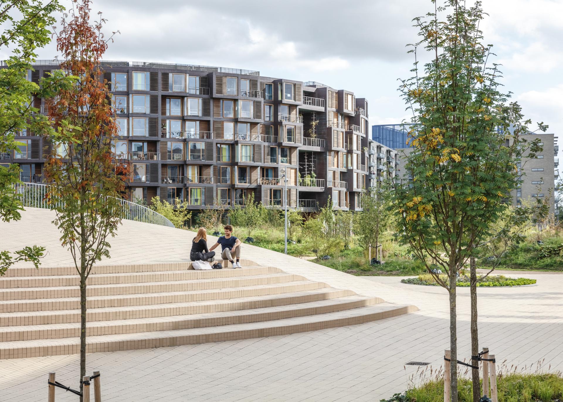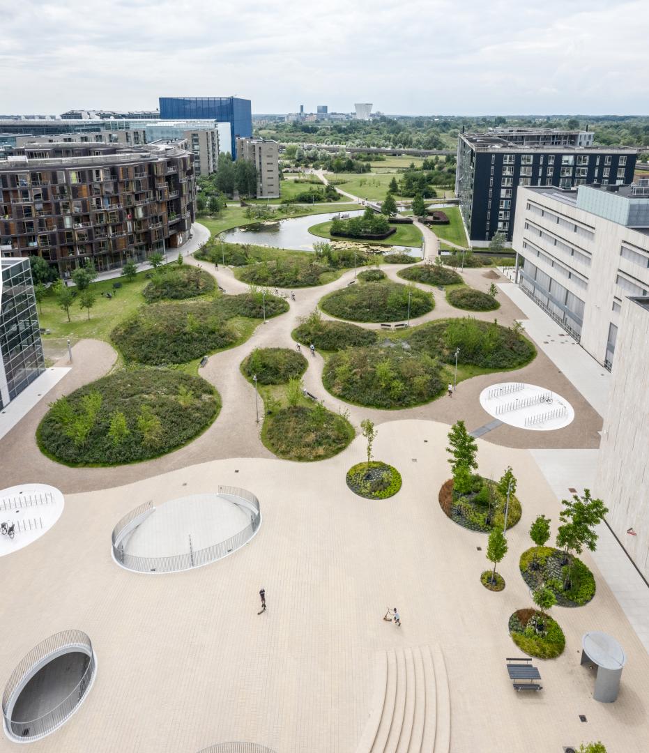 Occupying approx. 20,000 m², Karen Blixens Plads is one of the biggest urban spaces in Copenhagen. It is connected to Amager Commons through a gradual transition, which makes it a hybrid of park and public square, organized as a superimposed surface of human-made hills and valleys with room for 2,000 parked bicycles inside the hills. The square has an important functional role as well as a recreational resource. The necessary infrastructure is turned into a three-dimensional community hang-out.