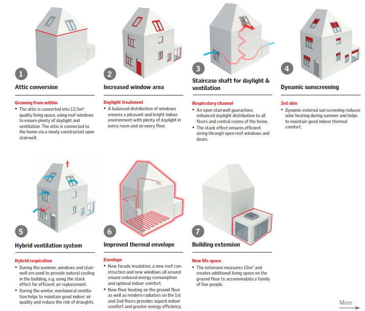 Seven renovation principles have been highlighted in the project and allow it to be reproduced in different set ups: improved thermal envelope & daylight conditions, hybrid ventilation system, extended living space, dynamic screening, and use of the staircase as a daylight & ventilation shaft.