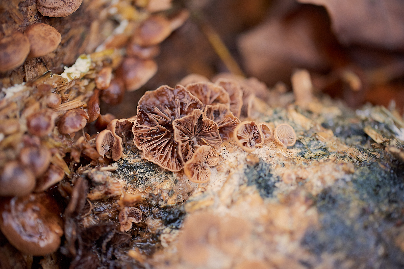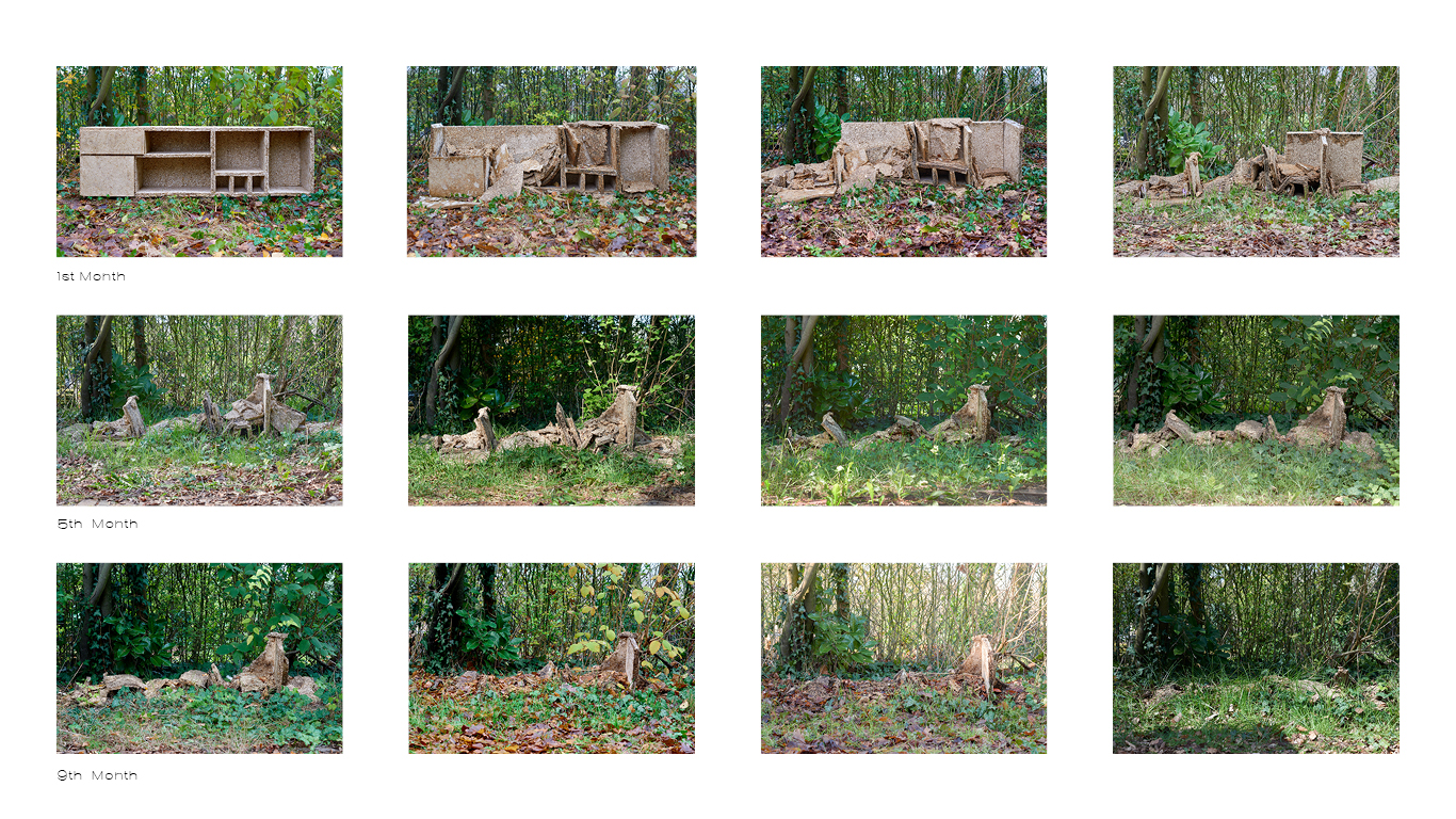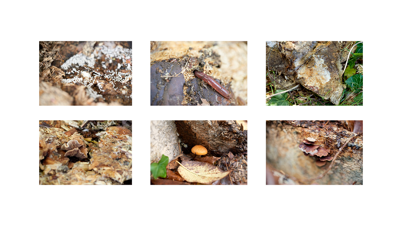 Next to the healthy qualities of our material, we want to achieve the way we look to waste in society, currently we look at garbage with disgust. But what if products show the beauty of decay, like Compostboard, what if beautiful mushrooms are able to grow on our products, giving shelter to other fungi and insects that eat, live, sleep or reproduce in the natural fibres and binders that people can put in there garden, or farmers can add to their soil. This quality we researched and can be seen in the photos. A first glimpse of last season’s decay.