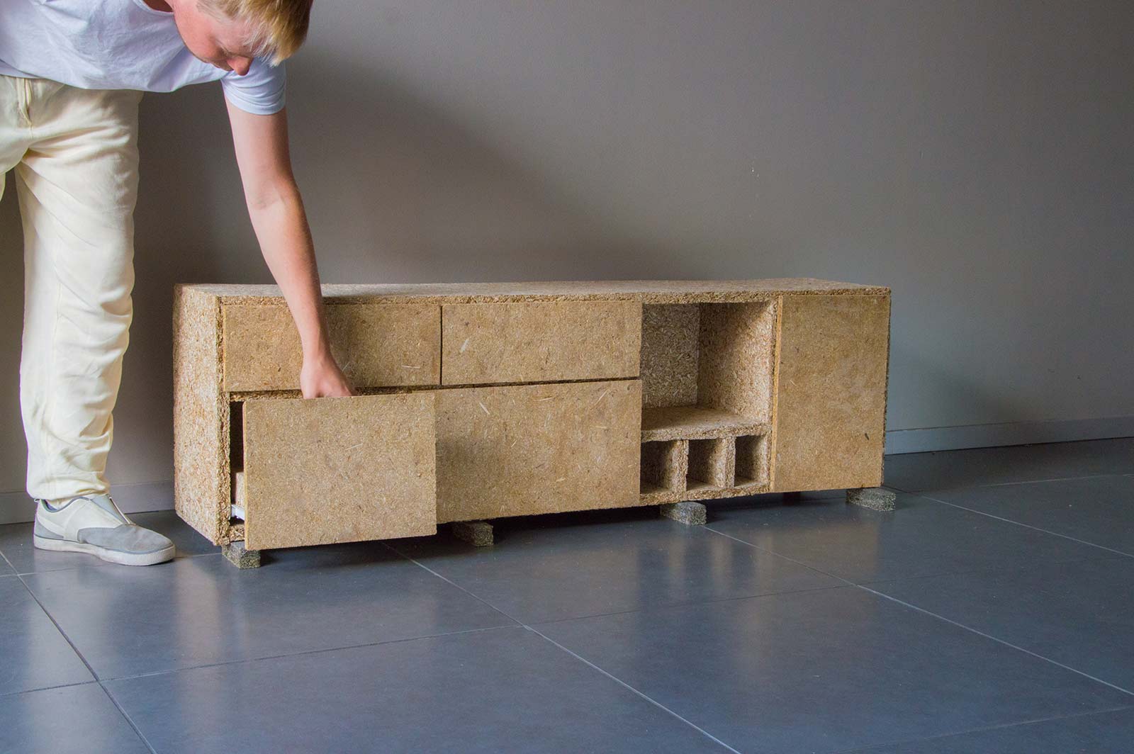 In the research of fibres we noticed the immense amounts of readily available chips from crop waste. Now burned or landfilled but potentially to be transformed to Compostboard. So we only use left-over streams of nearby agricultural landscape. Creating a opportunity to mass-consume sheet material without harm. As the amounts of chips are so big, there is the potential to build a production plant that can produce sheets for a price that can be purchased in a wide range of society.