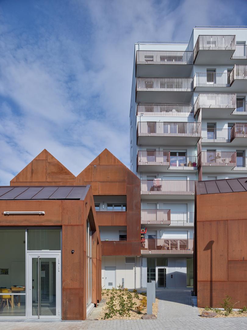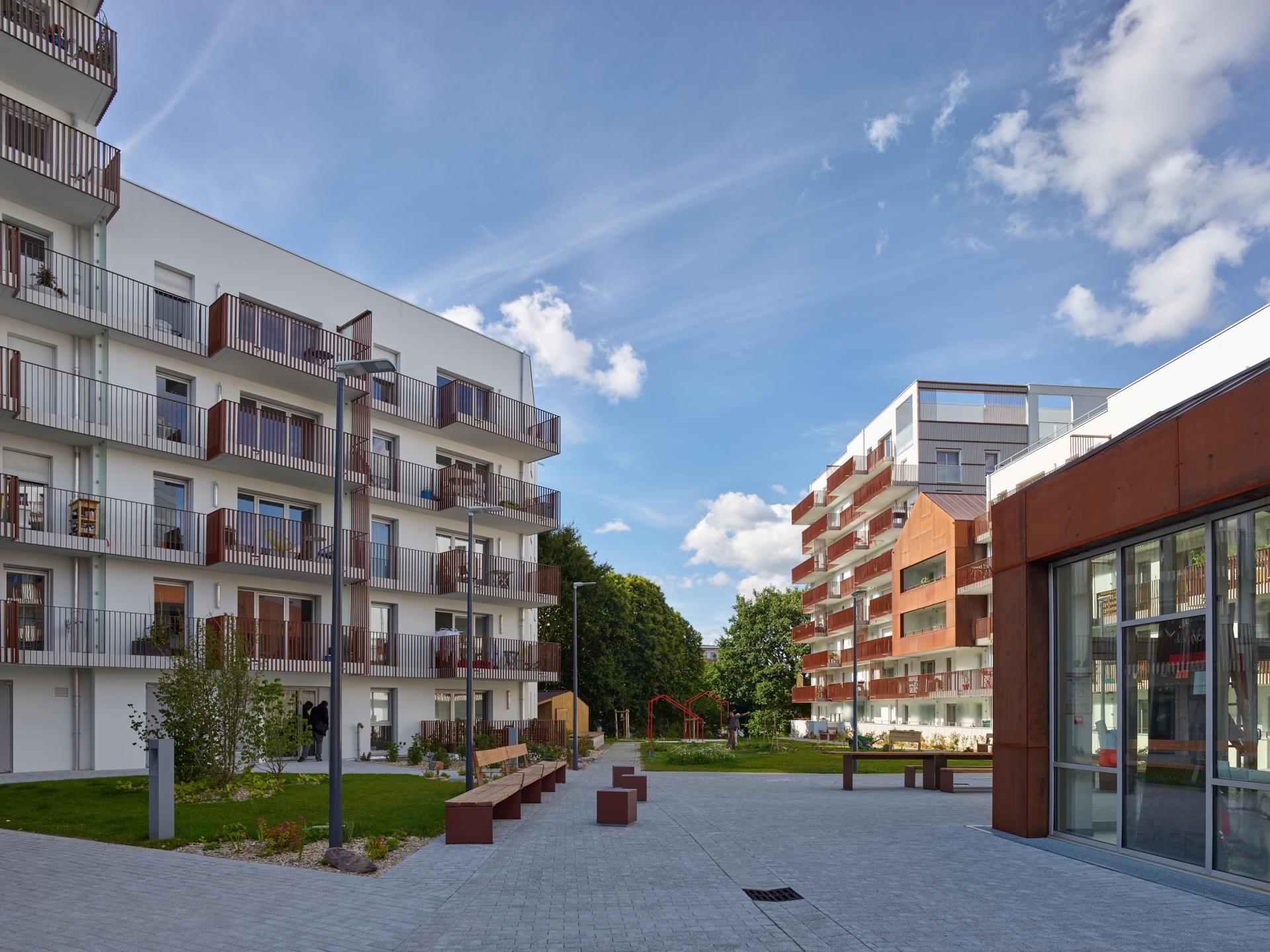 The Cours des Arts is an intergenerational residence of 119 dwellings, based on a mix and variety of housing types, with a large park in the middle. No distinctions between the tenants and owners is made, as they gather around the shared areas and take part in the resident’s association. The Cours des Arts explores various ways to mix private and shared areas, with its innovative “shared room” and breaks down the barriers around artistic practices thanks to the artists’ studios.