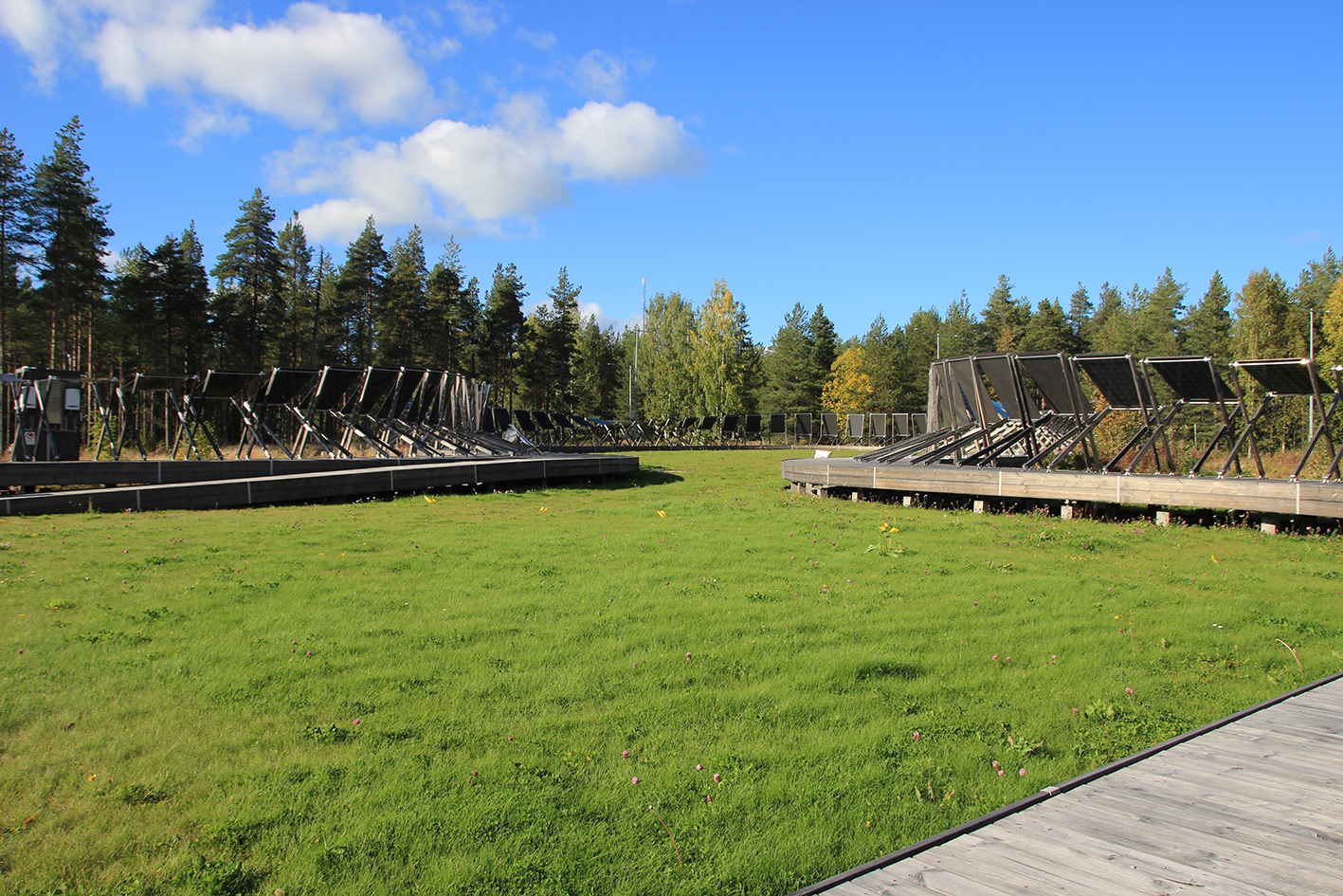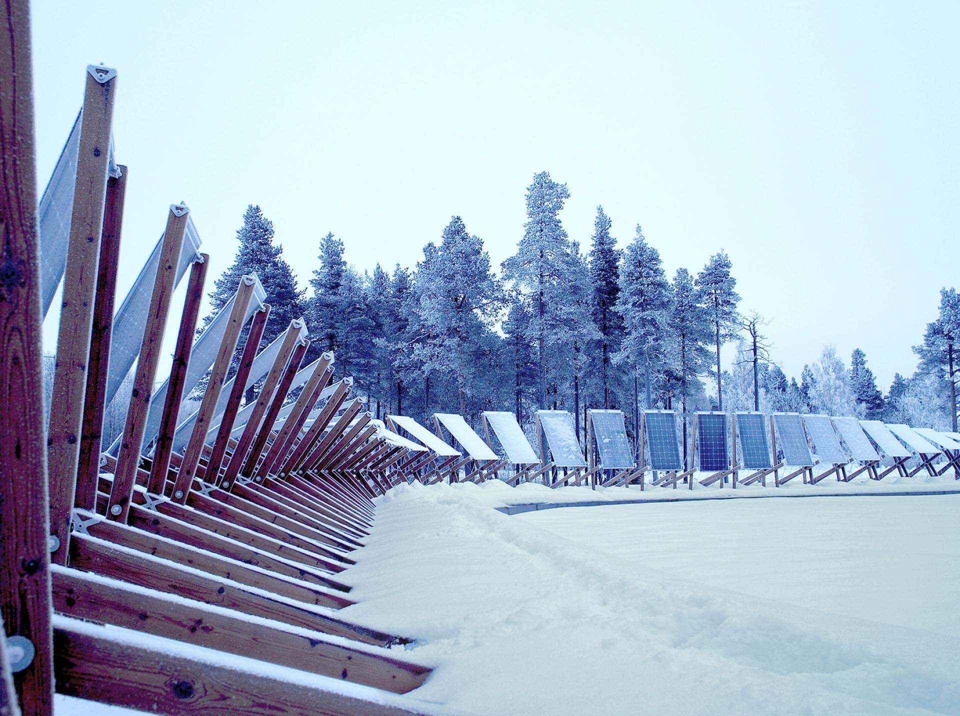 The panels is set up to calculate and analyze the best angles for solar production over the year and the wooden stands showing how different wood treatments age in the harsh climate.