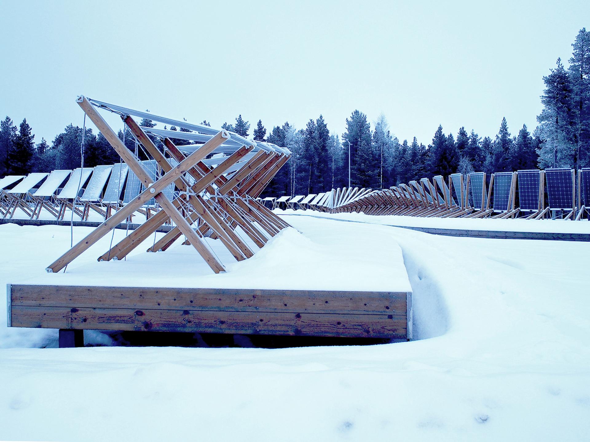 The Solar wave is a solar cell park and landscape room in the forest located on the Campus area Piteå Science park. Designed with parametric design and the nordic nature as inspiration, 117 double-sided solar panels on wooden stands created a landscape room for research, meetings and recreation. The double-sided wave form of panels is a research project of solar energy production from the reflection of snow, wooden durability in cold climate and social interactions in this spatial formation.