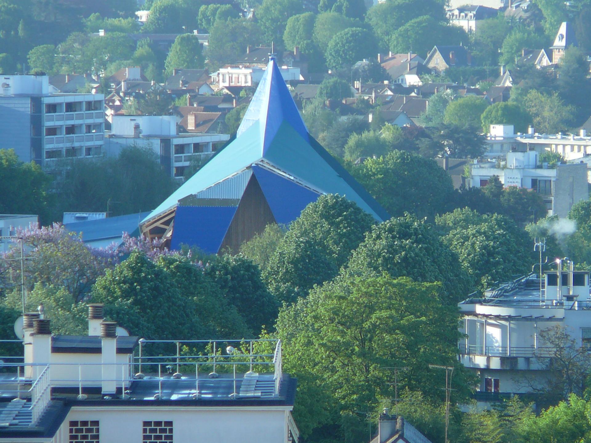 The innovative character of PPCM starts from the architecture of our building. Our purpose-built centre soars high above the surrounding suburbian landscape, a surprising architectural statement among the conventional public housing, houses and apartments of Bagneux. It could be mistaken for a church or a mosque with its blue and green spire rising skywards over the landscape.