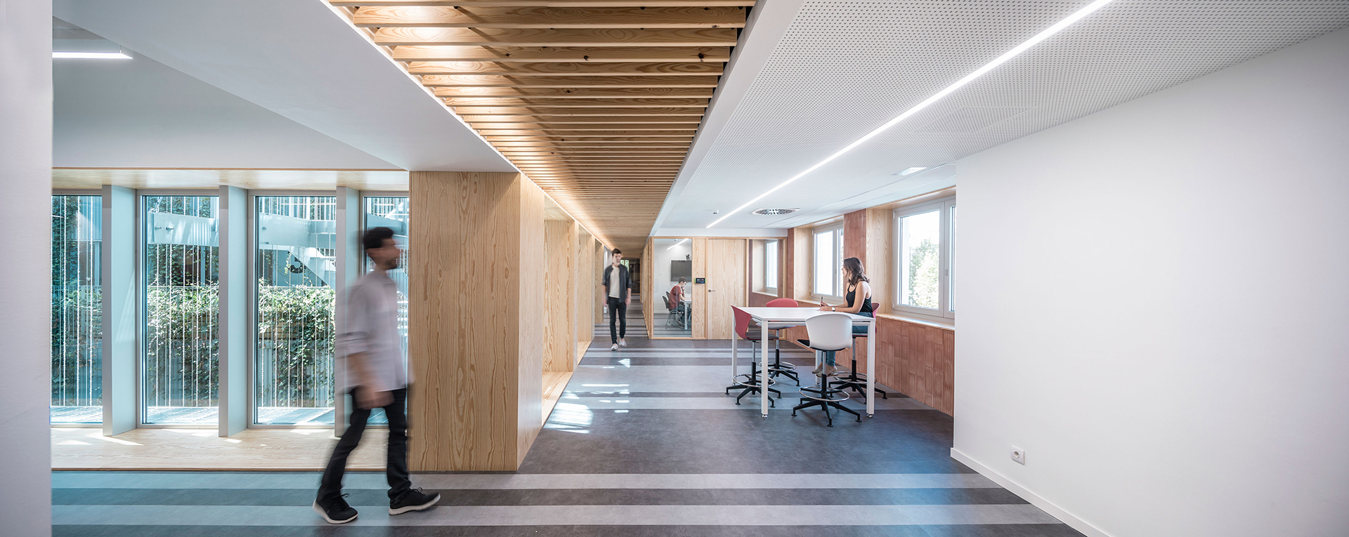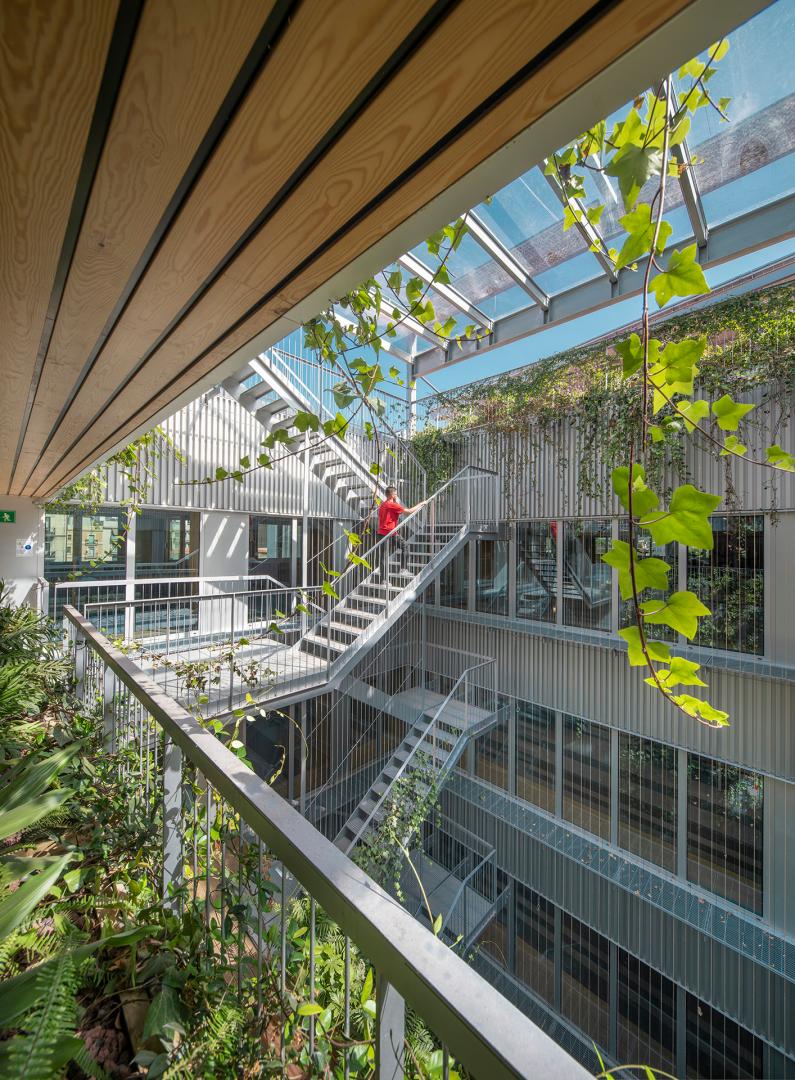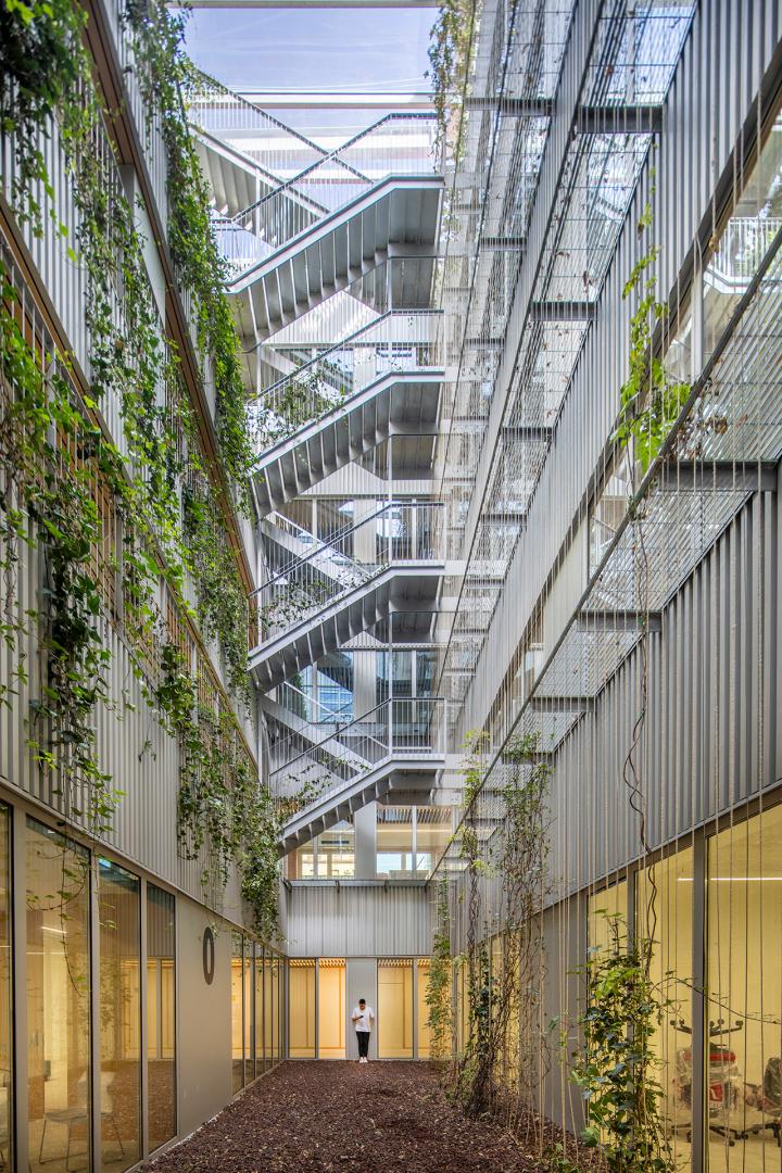 - The building is linked to the Districlima network and the rooftop's photovoltaic pergola produces promoting self-sufficiency and the building's productivity.
