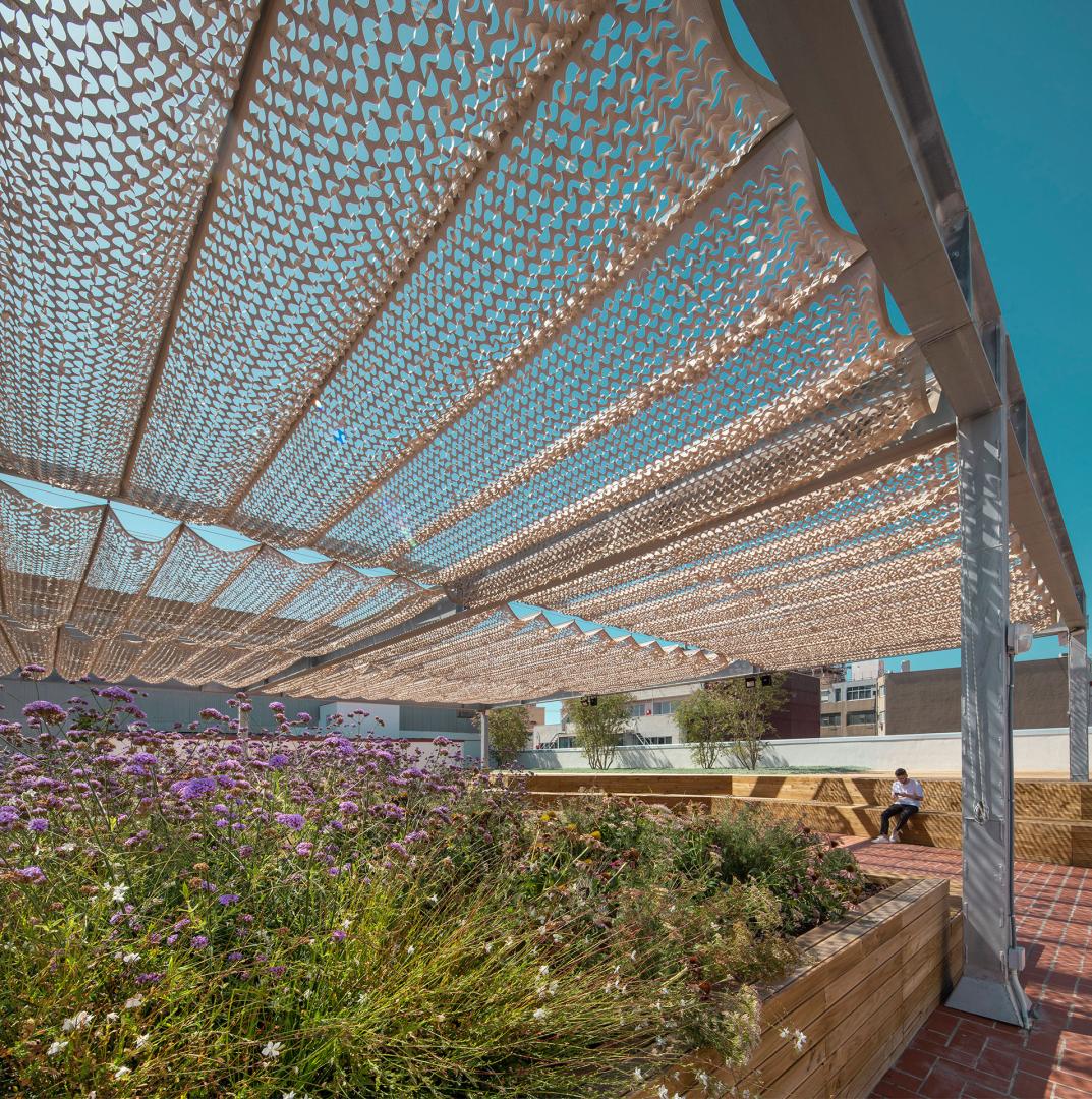 - Strategic elements are placed on the rooftop such as mobile canopies, or refreshing surfaces with lush vegetation that help mitigate the city's heat island.
