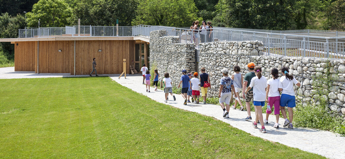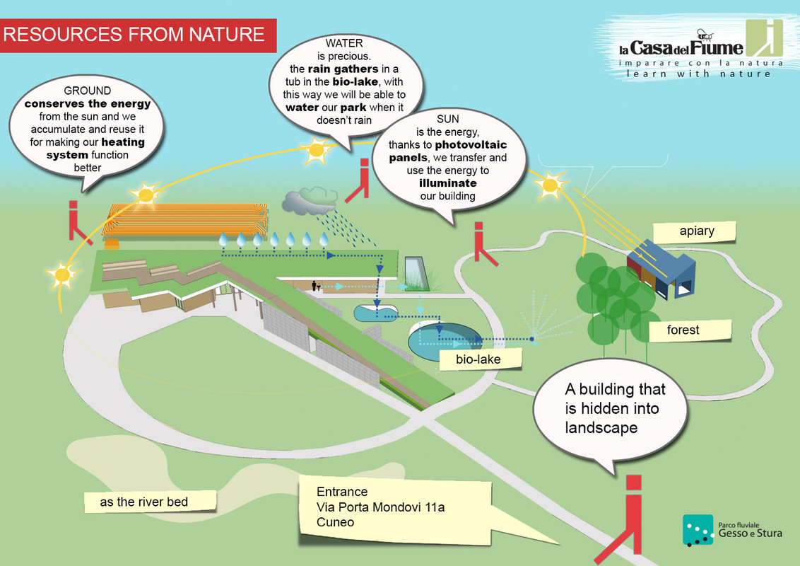 The project of the Casa del Fiume building and its garden is inspired by the principles of environmental sustainability that guide the activities of the River Park. The unitary design allows reading and visiting the centre as a full-scale "didactic maquette" that represents the environments of the river park and which can be read by following the traces of its generating element: WATER.