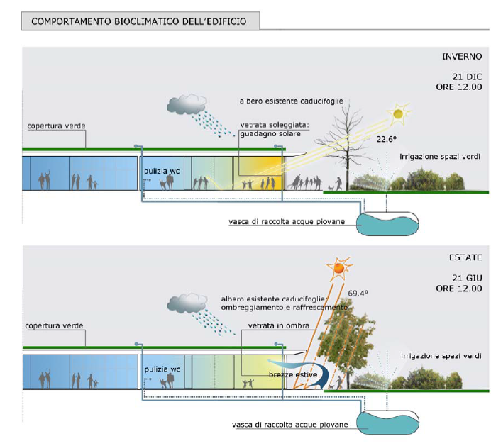 The greater part of the roof is made of a green roof with high thermal inertia and thermo-acoustic insulation which, in addition to expanding the possibilities of use of green spaces, the result of the idea of park and building as a single entity, allows to retain from 50% to 70% of rainwater, rebalancing the humidity levels of the air, preventing the roof from overheating in summer thanks to its high balancing power of thermal excursions and the cooling of the air in the vicinity due to vegetational evapotranspiration: it guarantees the creation of a scale microclimate of the building and its surroundings.