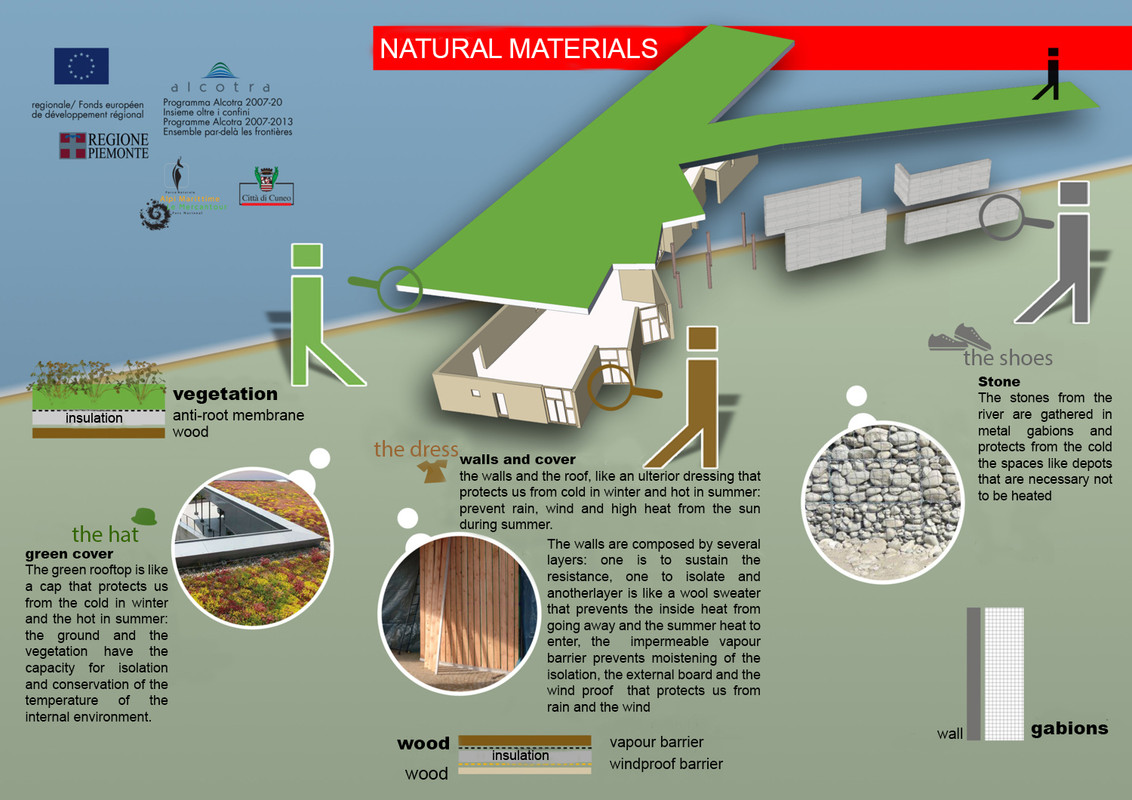 The path of materials shows the typology of building components based on local natural materials (tree pillars in solid wood, very durable stone flooring, natural hydraulic lime plasters, colours, and finishing dyes based on essences and pigments natural).
