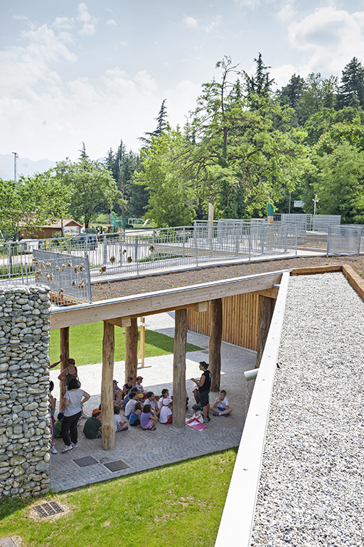 The green roof characterizes the project with its view of the city from above, from below with its simple and open shape integrates the building into the landscape and a ramp invites you to climb onto the roof garden to look towards the river. The purpose of environmental education is closely related to the concept of discovery of a space .