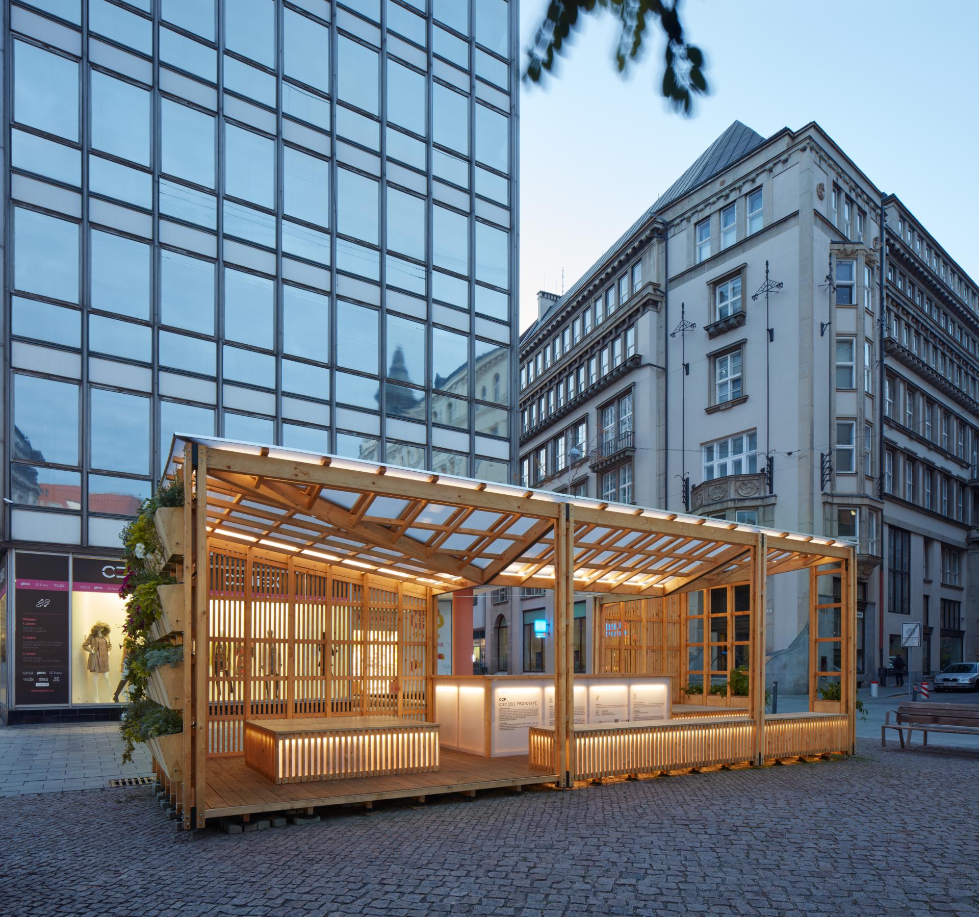 The aim of the design was to present an innovative modular solution that allows the replacement and later renewal of individual profiles. Depending on the type of construction (roof beam, column or wall), an adequate composition is designed based on the repetition of 60 mm x 40 mm profiles. The whole object of the prototype looks very light and airy, which was also the initial requirement of the design which was chosen to complement the environment in the city center. Thanks to the illumination the prototype will become an attraction and safe space also during evenings.