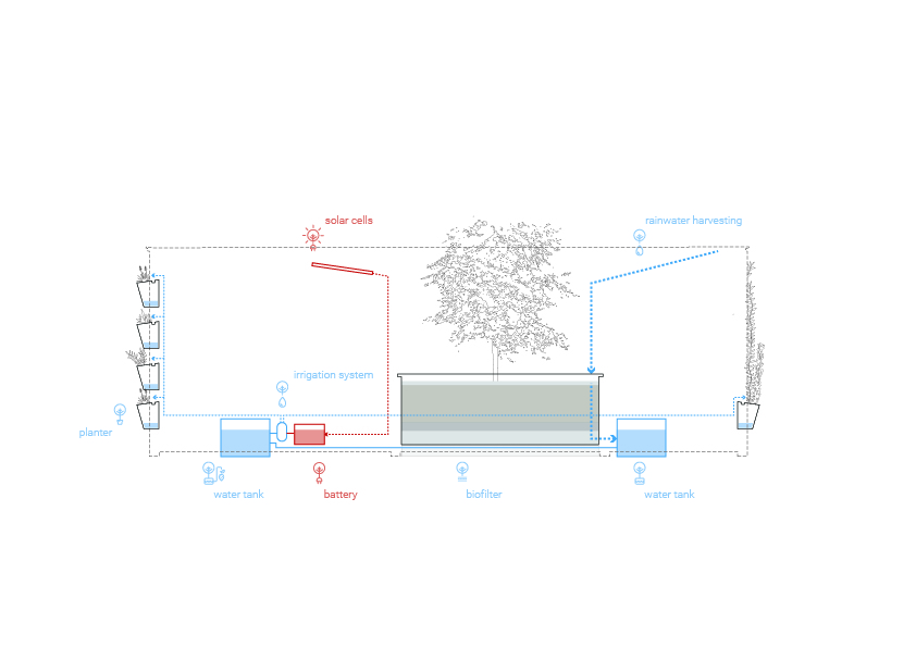 Its shape develops from the need of providing shading, water collecting, and the intent to create a spatial communication between the new object and the existing square, also achieved through the two-sided openness. Additionally, its structure was designed with easy replacement in mind in case of damage. The central part of the prototype is a biofilter, which collects rainwater from the roof, filtering rainwater through settling and phyto processes. Once filtered, the rainwater is then gathered in storage tanks, from where it is pumped by a drip irrigation system up to the vertical greenery of the structure’s outer walls. In addition to the vertical greenery, the biofilter allows water retention and evaporation, allowing the cooling down of the surrounding microclimate.