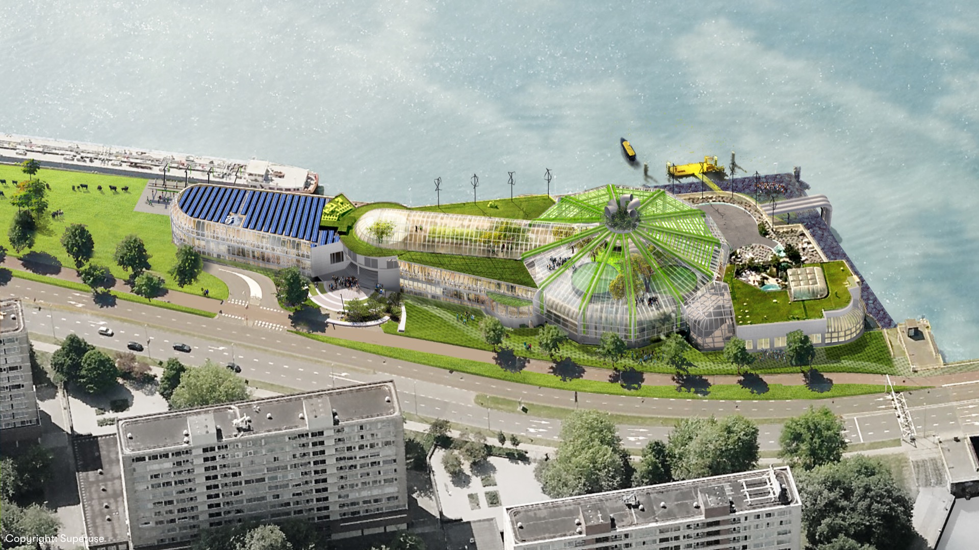 "BlueCity 010 is the dynamic transformation of an empty tropical swimming paradise into an example city that shows in an inspiring way that circularity and the circular economy are possible on an urban scale. The building offers entrepreneurs a place to work on solutions for the 21st century. This is supported by extensive facilities and a stage on which their work is visible to the world."