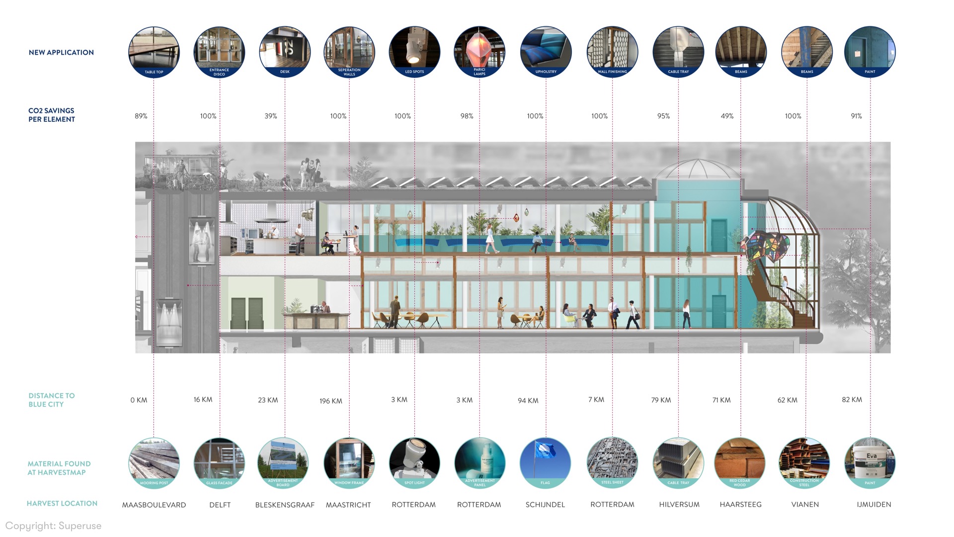 The new way to approach a design is that form and aesthetics follow resources. Superuse challenges the known appearance of components by putting them into a new, often surprising, context. This means that a visitor can enjoy a functional and beautiful space, while material use might be unconventional. In the Harvest Map (image 3) it is clear to see that reuse is not limited to a few elements, it's the core idea behind all elements. From structural beams to separation walls, from upholstery to wall finishes, from lamps and cable trays to furniture. Everything that the eye can and cannot see has had a previous life.