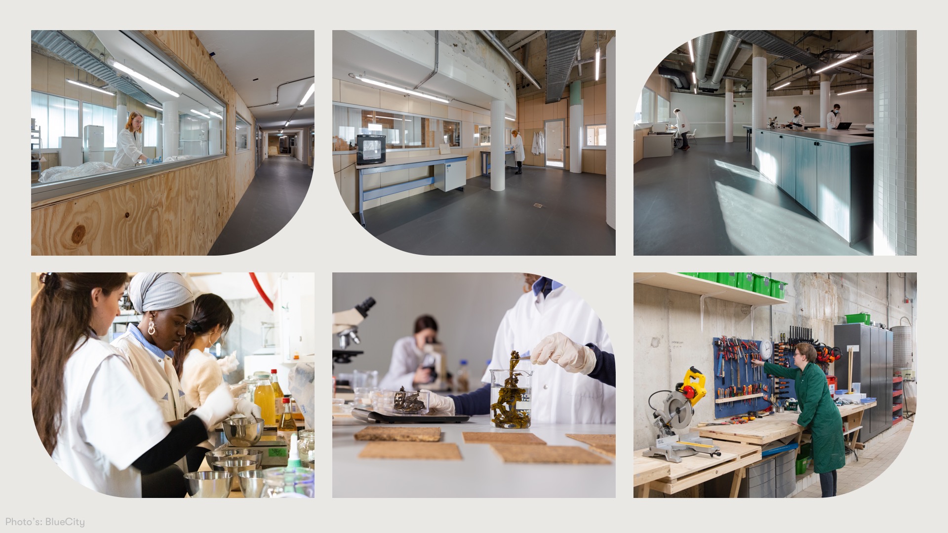 Currently the waterfront is almost finished, changing the parking lot in a parklike landscape. The basement stretches along the waterfront and contains offices and production spaces. The offices for, amongst others, Superuse and Better Future Factory, are located along the waterfront, while the inner spaces contain the Vet&Lazy Brewery, a Food Hub, Fruitleather and many others. BlueCity Lab has a wet and dry lab for experiments with algae and fungi. In this way BlueCity supports the development of new materials that can be tested inside the building before they are ready for the market.