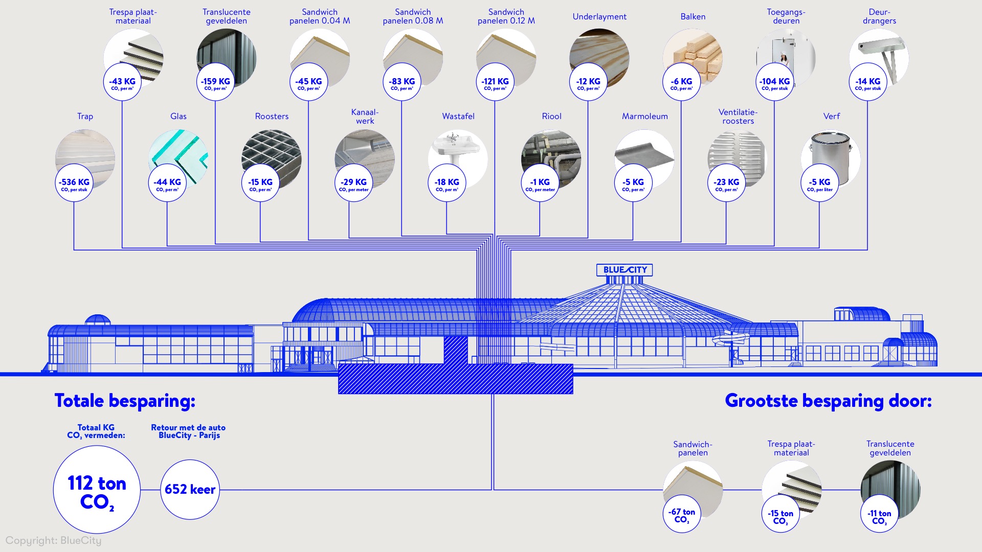 BlueCity is a renovation in the spirit of circularity on all levels, not just in the practical and physical results that we can measure, like reuse, carbon emissions, etc. It's also breathing social circularity in the intangible results, like influence and spreading knowledge. In the past years it has proven itself as a hotspot for regional circular economy events and innovations, currently offering space to 40 pioneering entrepreneurs ranging from artists and makers to thinkers and writers. It is a collective private enterprise, where it is shown how the real economy sometimes still clashes with the circular economy. Nonetheless it has been a living lab for the past 5 years where BlueCity, Superuse and the contractors are experimenting with a radical new way of constructing. The practical is combined with the aesthetical, the functional with the theoretical. The local reuse of materials has resulted in a 68% reduction of carbon emissions in the construction of the office environment. In BlueCity Lab we have achieved a reduction of 112 ton of CO2, which is equal to driving back and forth from Rotterdam to Paris for 652 times.