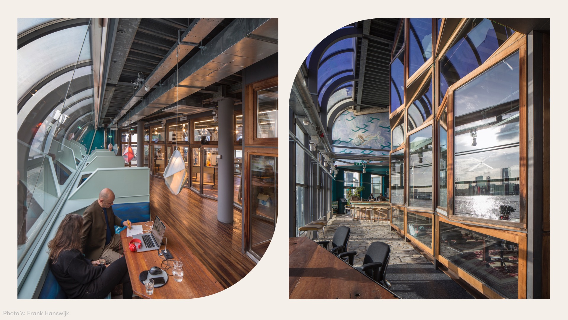 Superuse, as the architect of the transformation, is mainly involved with spatial development of the building, together with COUP as developer. Due to the scale the transformation is a continuous development, roughly taking 10-20% of the building at the same time. In the first stage the former discotheque has been converted to roughly 100 circular workplaces. A mix of private offices, shared offices and flexible desks and meeting rooms is situated in spaces made from reclaimed window frames. The reuse of materials lead to a carbon reduction of 68% compared to conventional office spaces. In one of the auditoriums private and public events are hosted that mainly revolve around the circular and blue economy, for example #FuckUp nights and #PechaKucha talks.