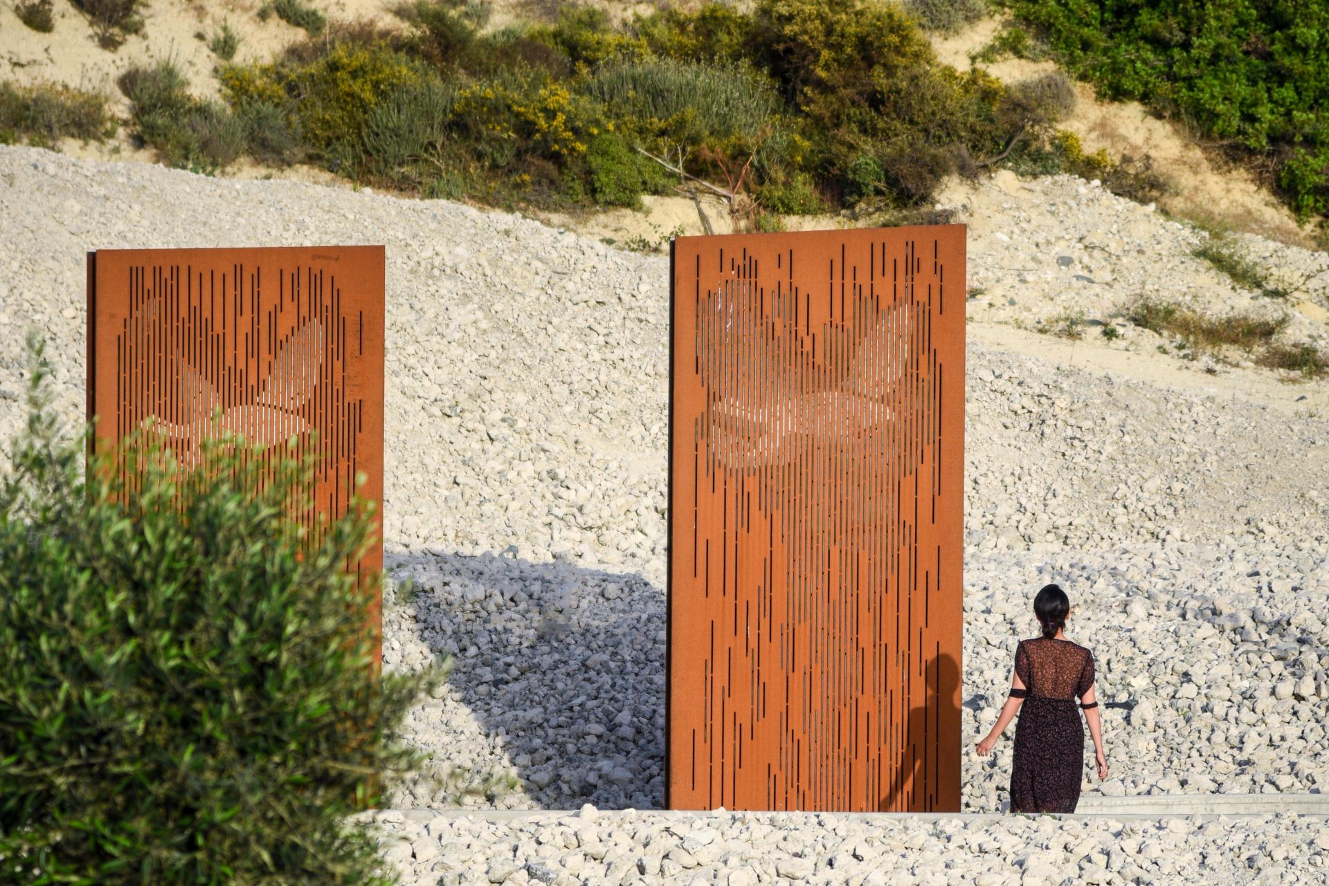 The visitor is invited to follow a journey with spatial, material, and symbolic references (corrosion, perforation, disintegration) accompanied by the olive tree, the only living form of the composition. The journey concludes at the plateau dominated by the out-of-human-scale steles to discover the memorial inscription: ‘Σιγώ και αληθεύω, φύομαι το φως’, 'I am silent and unfeigned, I am heaving the light'. The passer-by (drivers and passengers in vehicles) participate in an interactive experience as their brief encounter with the memorial activates the flock of thirteen birds for their eternal journey.