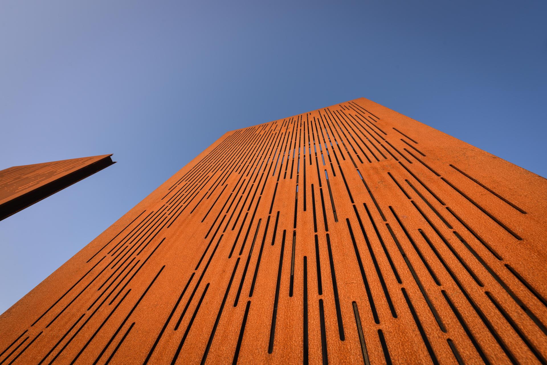 The steles, made of digitally fabricated weathered mild steel, are arranged on the outer boundary of the promenade. This element consists of a continuous low wall bearing the names of the fallen which disintegrates into thirteen accenting individual steles. The steles depict a moving interactive theme (flock of birds), visible by moving vehicles.