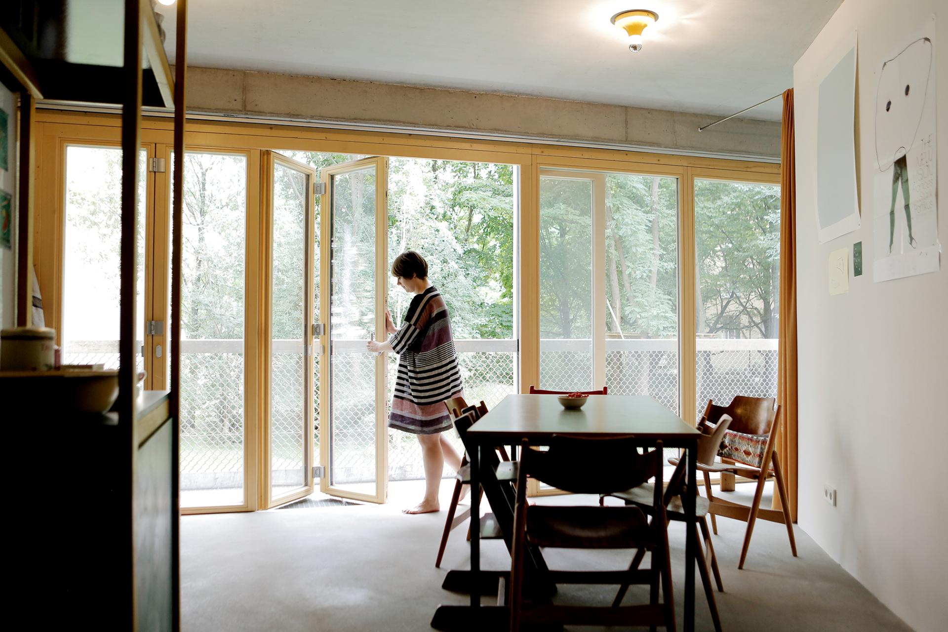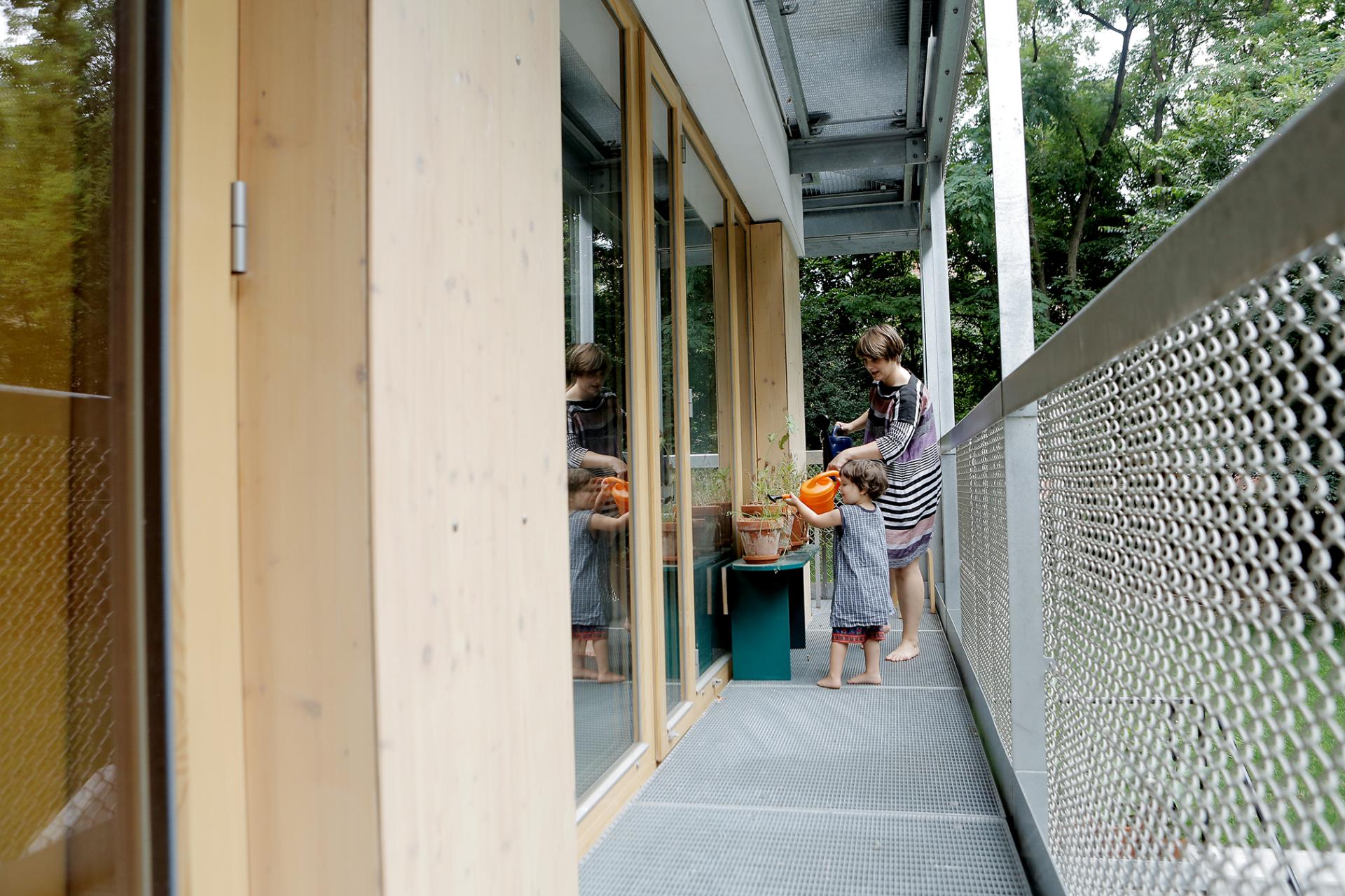 Each apartment and all additional community spaces were developed by an intensive process of consultations, discussions and design. Based on the structural framework the sizes of apartments could be determined and individual requirements accommodated in the floor plans. In parallel to this process, a common standard for fixtures and fittings was developed and defined, which has resulted in a collective approach to interior fittings, the use of materials and some surfaces left unfinished, whilst allowing individual layouts of the apartments. This kind of structured yet open design process has not only allowed for extensive participation, self-directed design and self-building, but has also led to mutual agreement on the type, location, size and design of spaces shared by residents. This includes the generous urban garden, which naturally blends into the landscape of the surrounding 1960s residential neighbourhood, an access ramp leading to a covered area in front of the basement, a laundry, a workshop and a roof terrace with a summer kitchen and a winter garden. The all-around balconies accompany the bright interior spaces and connect the apartments on each floor.