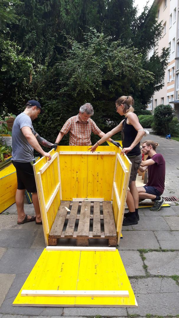 The pop-up garden modules can be easily assembled by non-skilled workers and cared for by inhabitants so that they can be set up in the whole city. They can change parking spaces and lots into gardens for temporary use in order to show possible future uses of land. They can also create new larger public spaces for playing, meeting, discussing local matters.