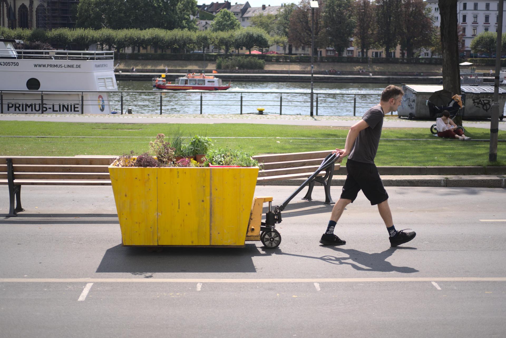 Design-wise and functionally, the flower beds were complemented by benches. In addition, the concrete bollards used for the temporary road closure on the northern bank of the Main were upgraded and provided with seating. The modules were built, planted and maintained together with neighbors and residents of Frankfurt. During the project, there were also open events around the pop-up garden, inviting people to discuss the topics of nutrition and gardening as well as the future change in traffic. They create an occasion for exchange and ideally trigger an active civil society in other places as well.