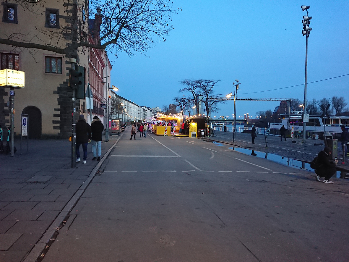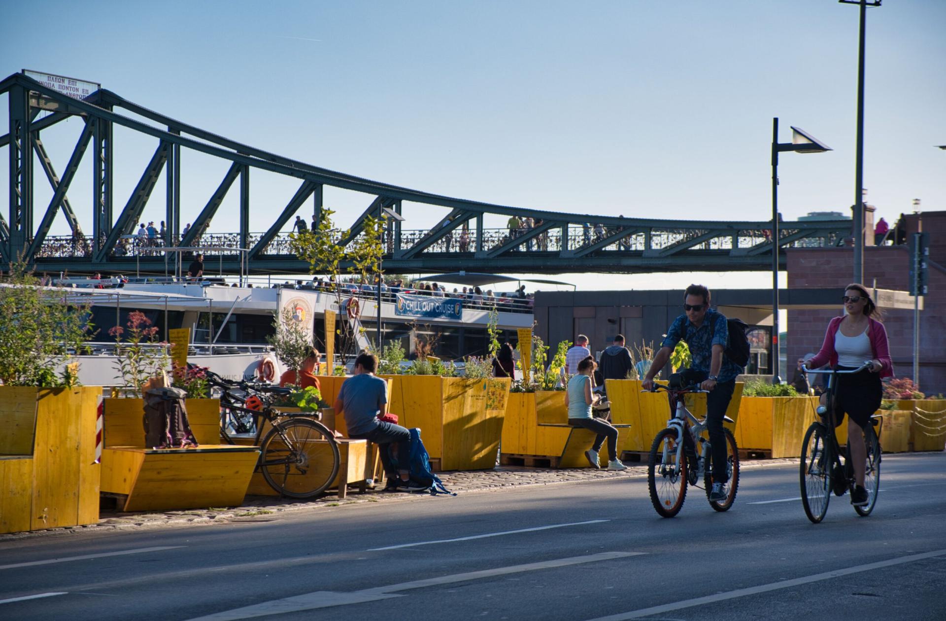 In the summer of 2019, the city of Frankfurt am Main launched a 13-month traffic experiment in which the street section of the Mainkai on the northern bank of the Main between the Untermain Bridge and the Old Bridge was closed to car traffic and reserved for pedestrians and cyclists.