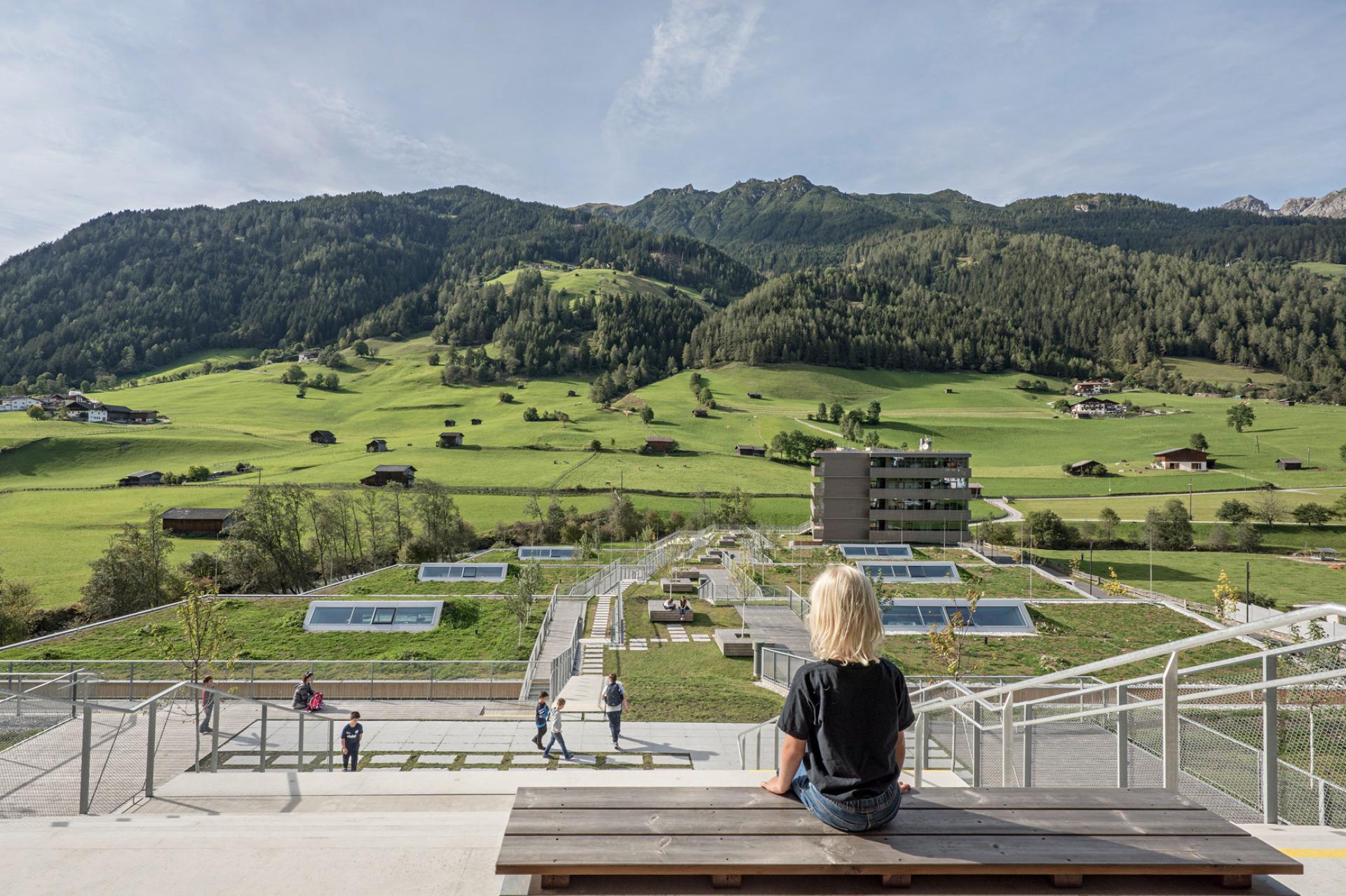 The careful approach to this alpine landscape and the scale in relation to the neighboring rural structure makes the project appear modest, yet self-confident. The school campus is designed as a flat, terraced, walkable green educational carpet.