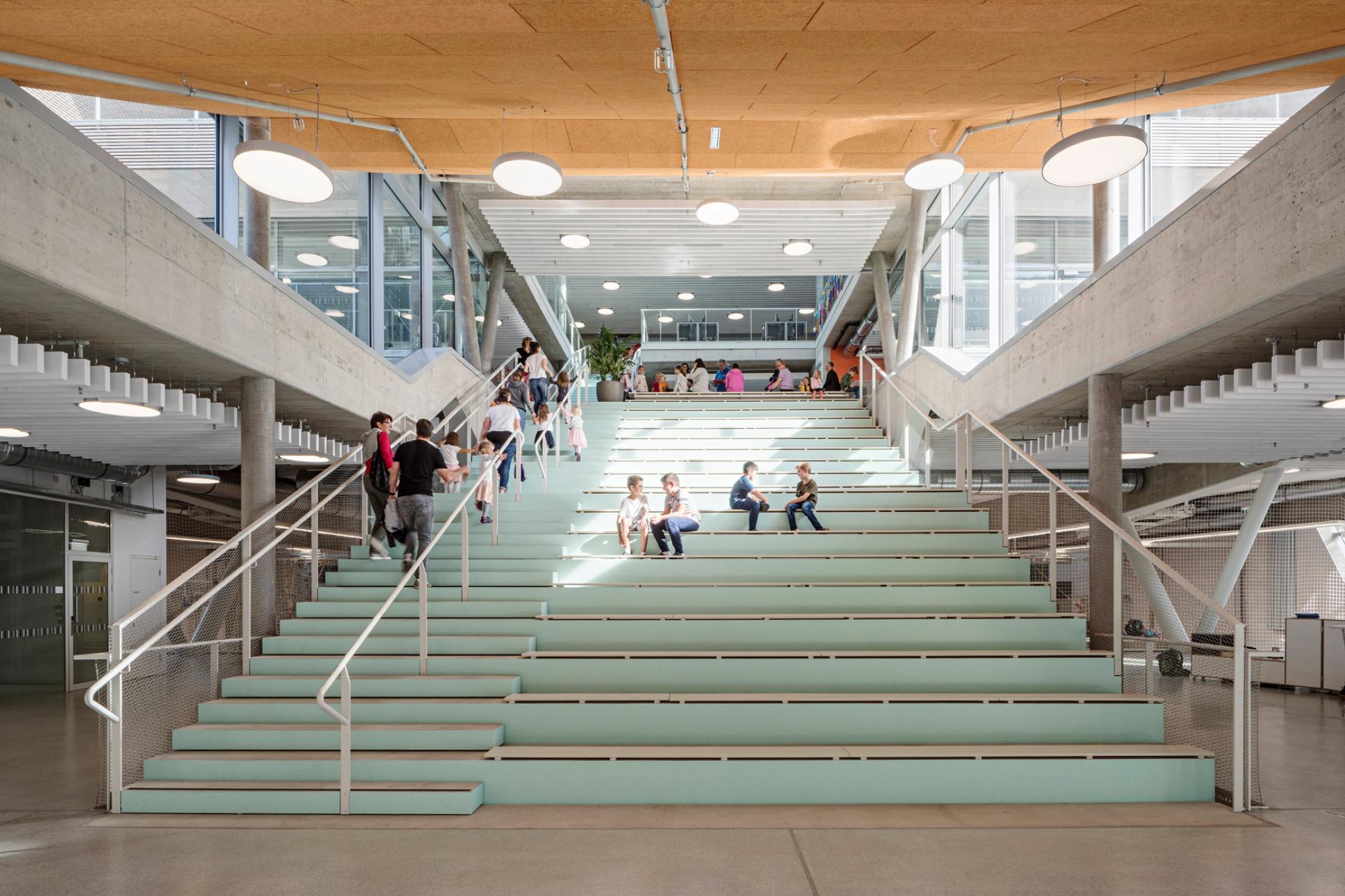 The "indoor campus" includes a central two-story auditorium, a space for events of all kinds, a meeting point for all students and community members. a spacious seating arena connects the entrance area to the library, with the music and gyms, which are located one floor below.
