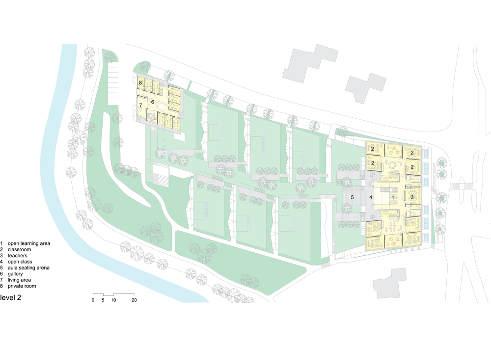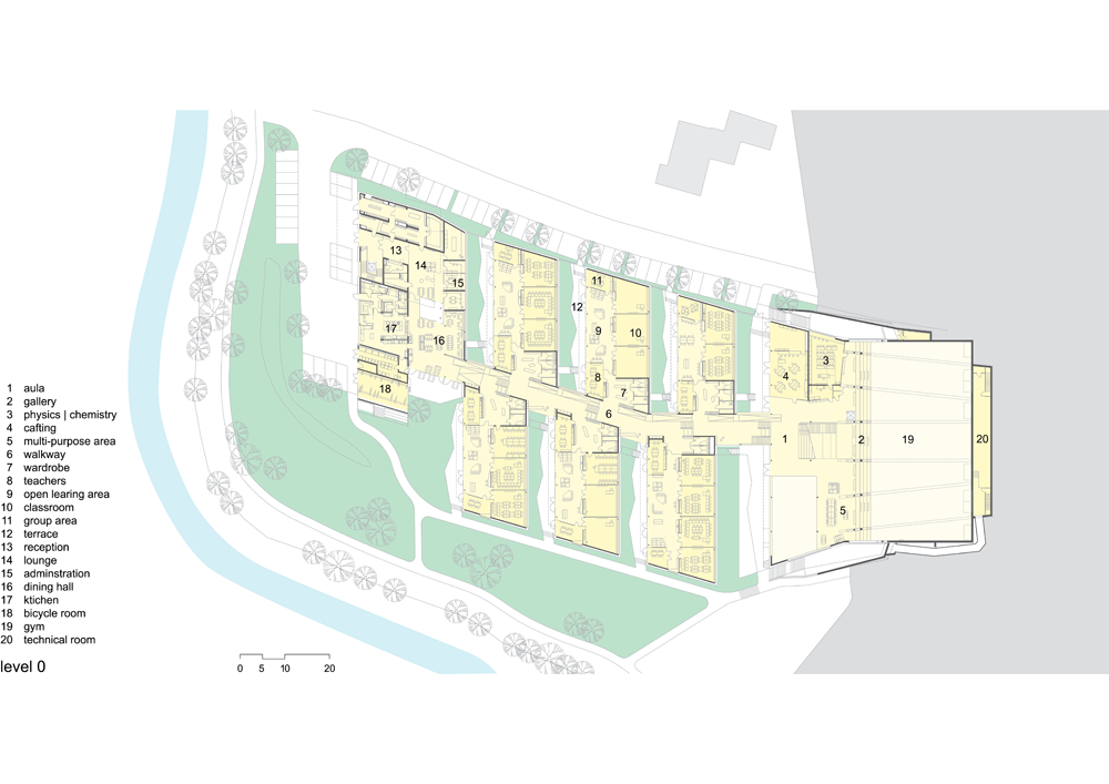 A two-story entrance building protects the green carpet behind it from the noisy street, while the boarding school for sports floats above the terraced grounds at the northwest corner of the property. These two buildings frame the cascade-like educational carpet.