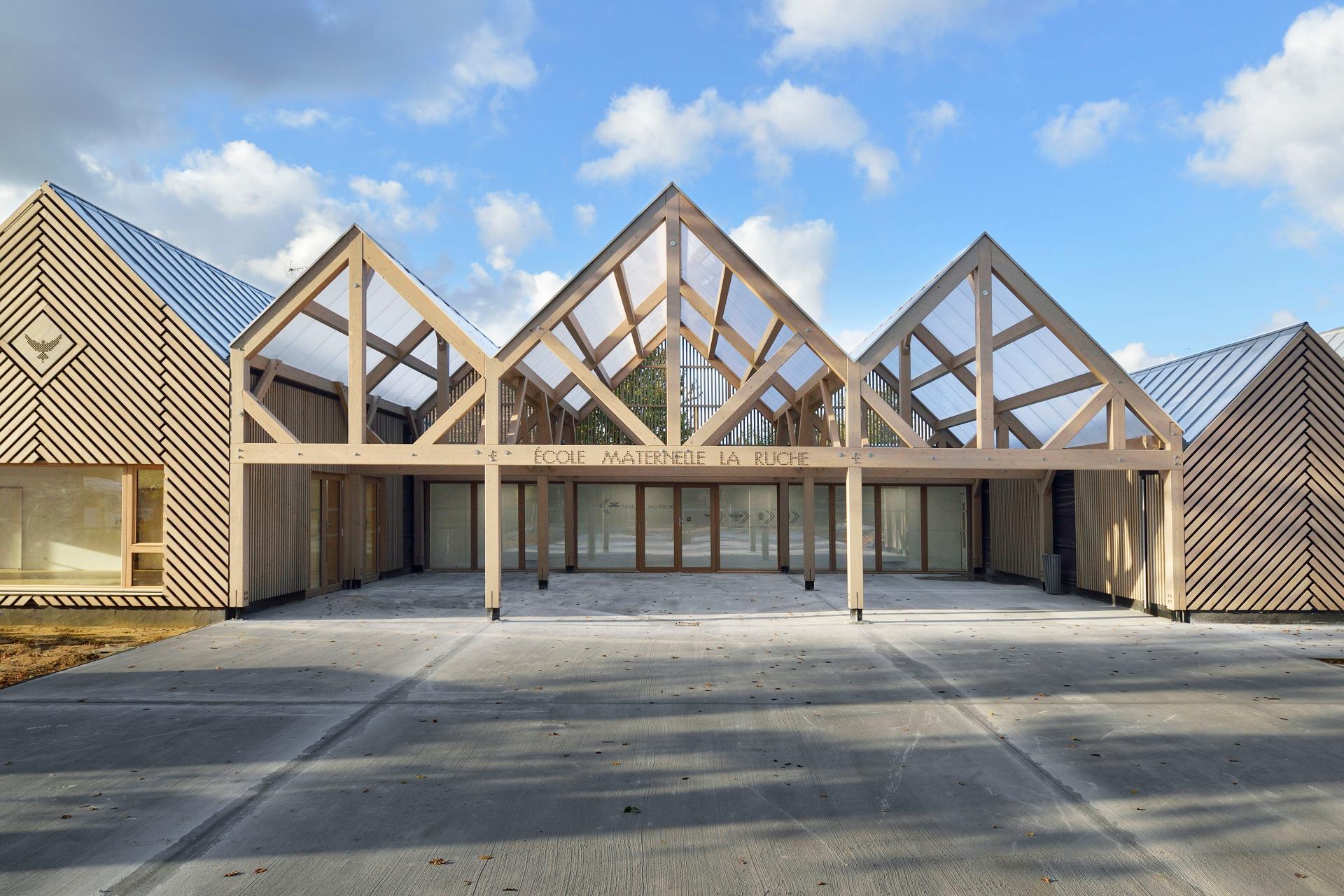 Grâce à des efforts conscients de réduction des perturbations, la construction était encore achevée en 10 mois rapides. La ville dans laquelle s'est déroulé le projet fait partie du parc naturel régional (PNRGF) qui conduit le projet à se réaliser avec de grandes ambitions environnementales. Le projet est construit à la fois avec une ossature et un revêtement en bois, et sa disposition linéaire crée une zone spacieuse qui encourage la nature piétonne continue du centre commercial et de l'emplacement de la maternelle. Ce nouvel espace est visuellement plus généreux et renforce le caractère bucolique et intime du sous-bois dans lequel s'insère le nouvel équipement. En venant «vivre», ce parc offre l'opportunité de poursuivre son inscription dans l'histoire de la ville et offre un espace généreux approprié pour tous les habitants de Perthes et leurs enfants.