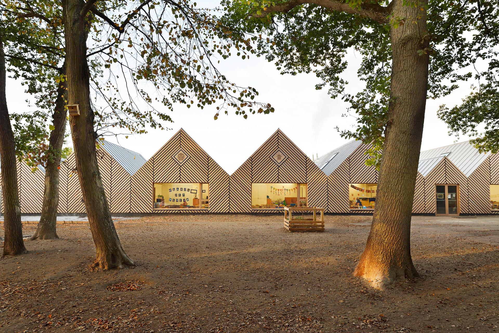 The form of the project borrows its archetypal and typical geometry from the historic town center. Form reinterprets their iconic profile to draw an appropriable symbol. The new school is set up on the same level, and in linear, which allows to create, volumetric identities distinct by space, with variable widths and heights by program. Inside these volumes able offer a particular spatiality and generous to the premises teaching. These volumes are very widely opened on the playgrounds and in the backdrop of the wooded “promenade”. All indoor spaces, designed with the ladder of early childhood as a major reference, are cradled in natural light, in bright and warm spaces. The scale pitched roof to 45 °, draws a house like a child could do, simple, iconic, graphic. The bugs symbols applied in classroom gable are used indoors for signage