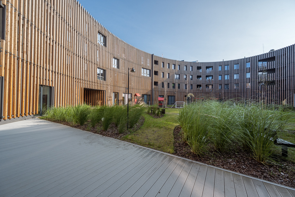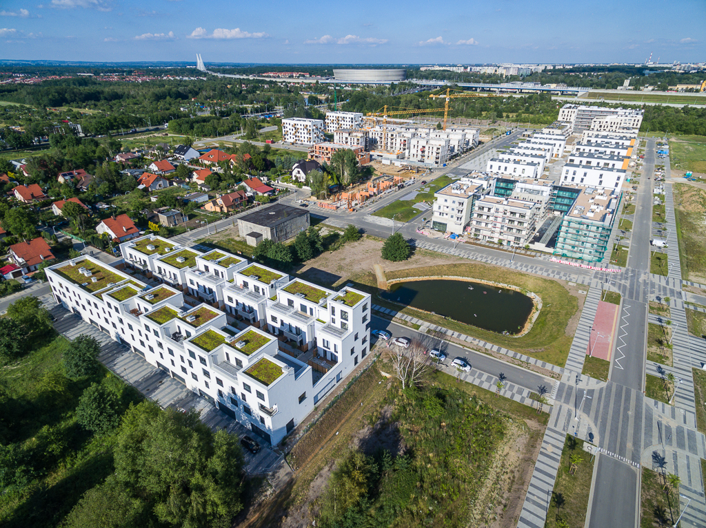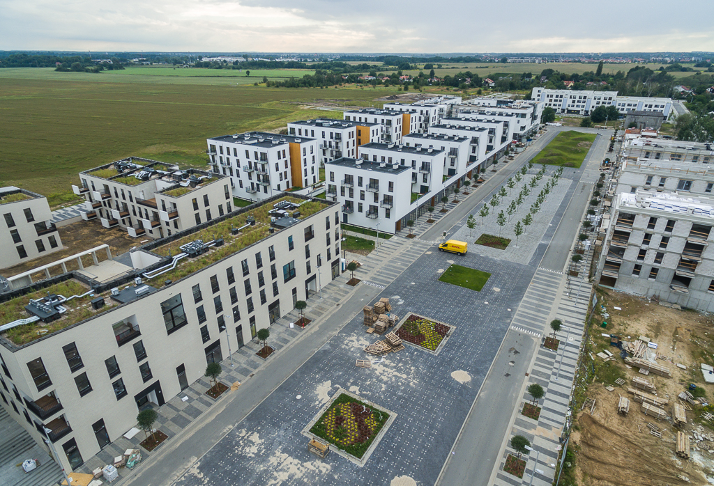 Our main goal were: self-organization of the foundation, low-emission, circularity and self-renewal. Human friendliness and respect for the environment. The design of the estate uses rainwater retention, district heating, lighting based on energy-saving LED lamps, a large amount of greenery in public spaces. Low-level houses protect the natural retention of the area, do not disturb the natural water conditions of these biologically active areas. The trees on the native land have been preserved. The adaptation of the area took place with the provision of full water retention in the reservoirs, which were given a recreational character, the construction of a municipal beach at the community center was planned. The reduction of emissions is also ensured by the use of LED lamps, district heating (no boiler rooms nor stoves). The roofs are equipped with endemic gardens where rainwater is also used. Photovoltaic panels are located on some roofs and facades - as screens ensuring the aesthetics and intimacy of the inhabitants. The motion devices in local gym are equipped with a power generating system supplying the common parts of the housing estate. Model vegetable gardens with irrigated pots were created for children. There are competitions for small gardeners.The estate was established on the basis of two main urban axes along which most social and commercial services are located, what ensures that all functions are accessible by pedestrians. All facilities were designed in accordance with the principles of sustainable development and respecting costs, making them affordable, which allowed for the desired social mix. A lot of attention was paid to the design of the space between the buildings: public, semi-public, neighborhood and private. The crucial issue was the diversification and accessibility. It's human-centred housing, reinventing a holistic approach in designing city districts with simple humane happiness.