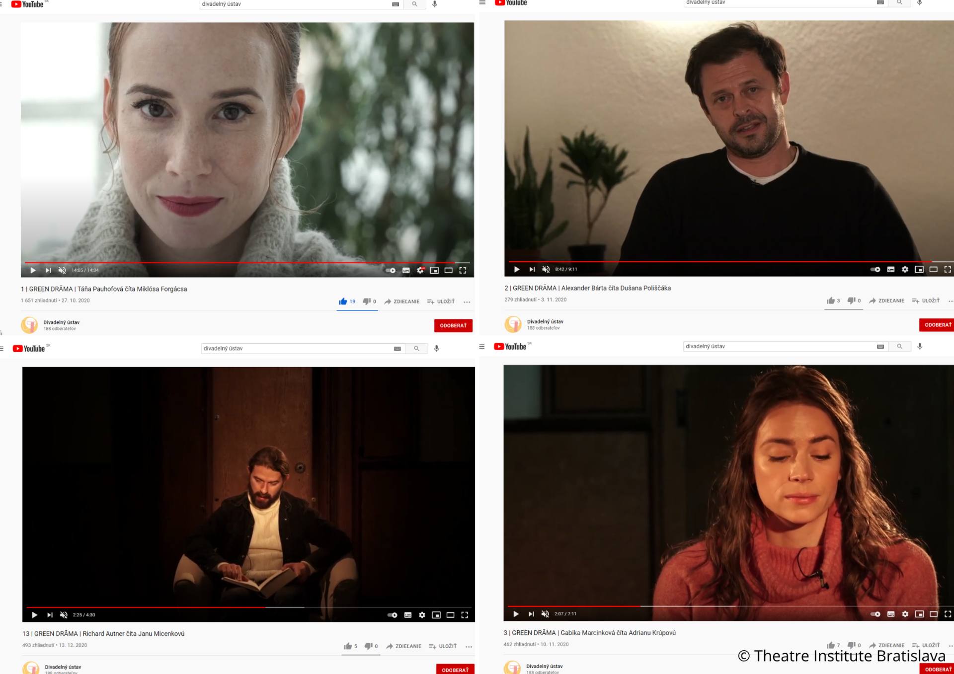 - Slovak institutions abroad (Rome, Paris, Prague). Together with the Prague Institute, we created a series of online videos called “A Month with Slovak Drama” in which we presented play samples and interviews with the authors as well as theatre experts in the field of “ecology in contemporary theatre and drama” – https://youtu.be/K2OkZB3-9AQ