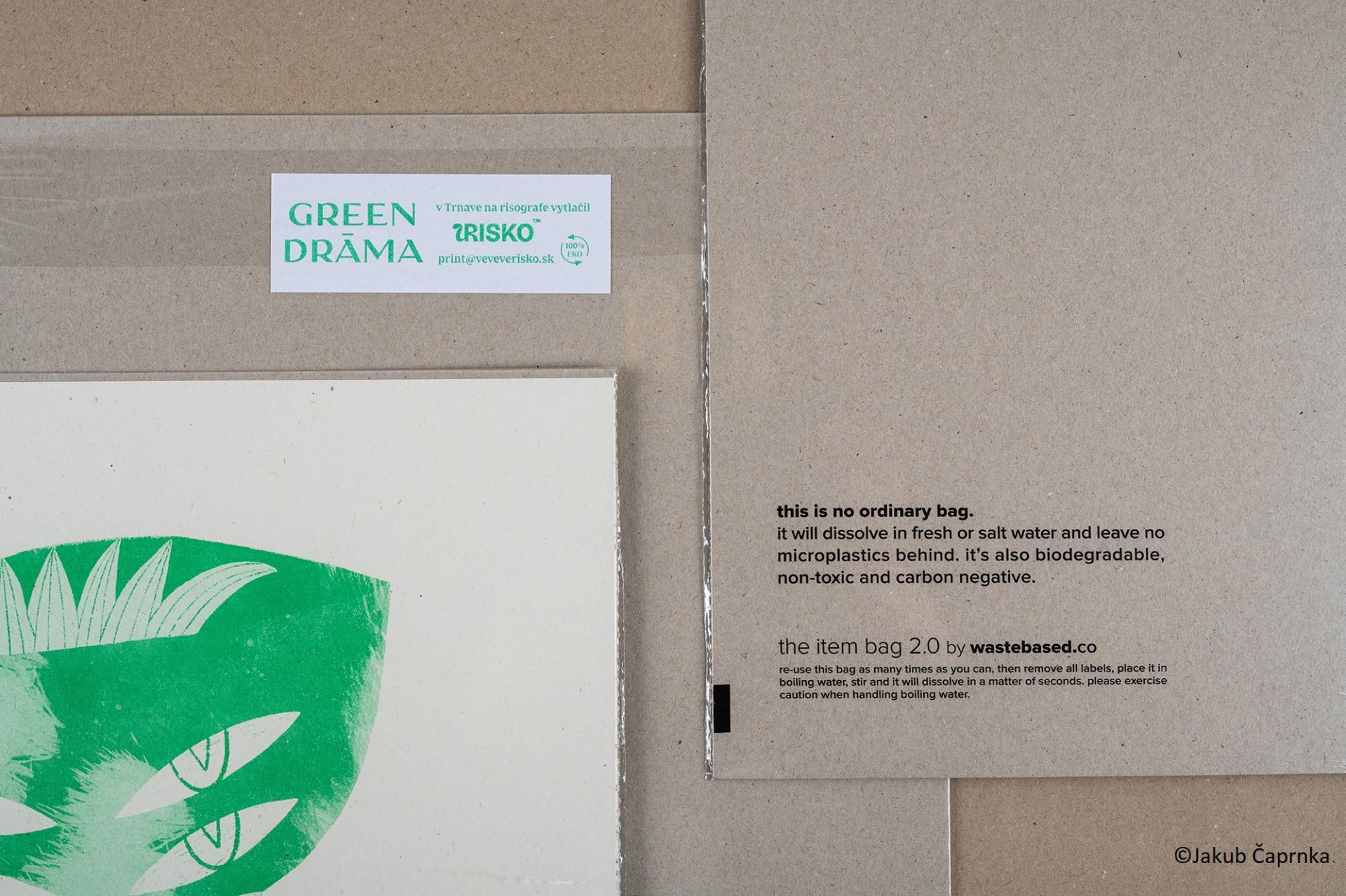 Our innovative contribution also relied on focusing on environmental sustainability when selecting and printing the materials for the collection. Using such materials should find preference in all activities – but this has to be extensively communicated in order to inform people about such possibilities. The book’s cover is made from natural canvas and we used Pantone Green as a shade of the natural green colour. The large-scale printing of graphics was done using a Risograph. Risograph is a Japanese printer using a specific printing technology. The matrixes used by the Risograph to print individual colours are made from banana peels and the printing colours are made from soy or rice oil. Riso uses nearly 80% less energy than a laser printing of similar size. The graphics were printed on recycled paper and covered in a starch wrapping that we use as an ecological alternative to Cellophane. Whenever the wrapping is no longer useful it can be disposed of by dissolving it in hot water.