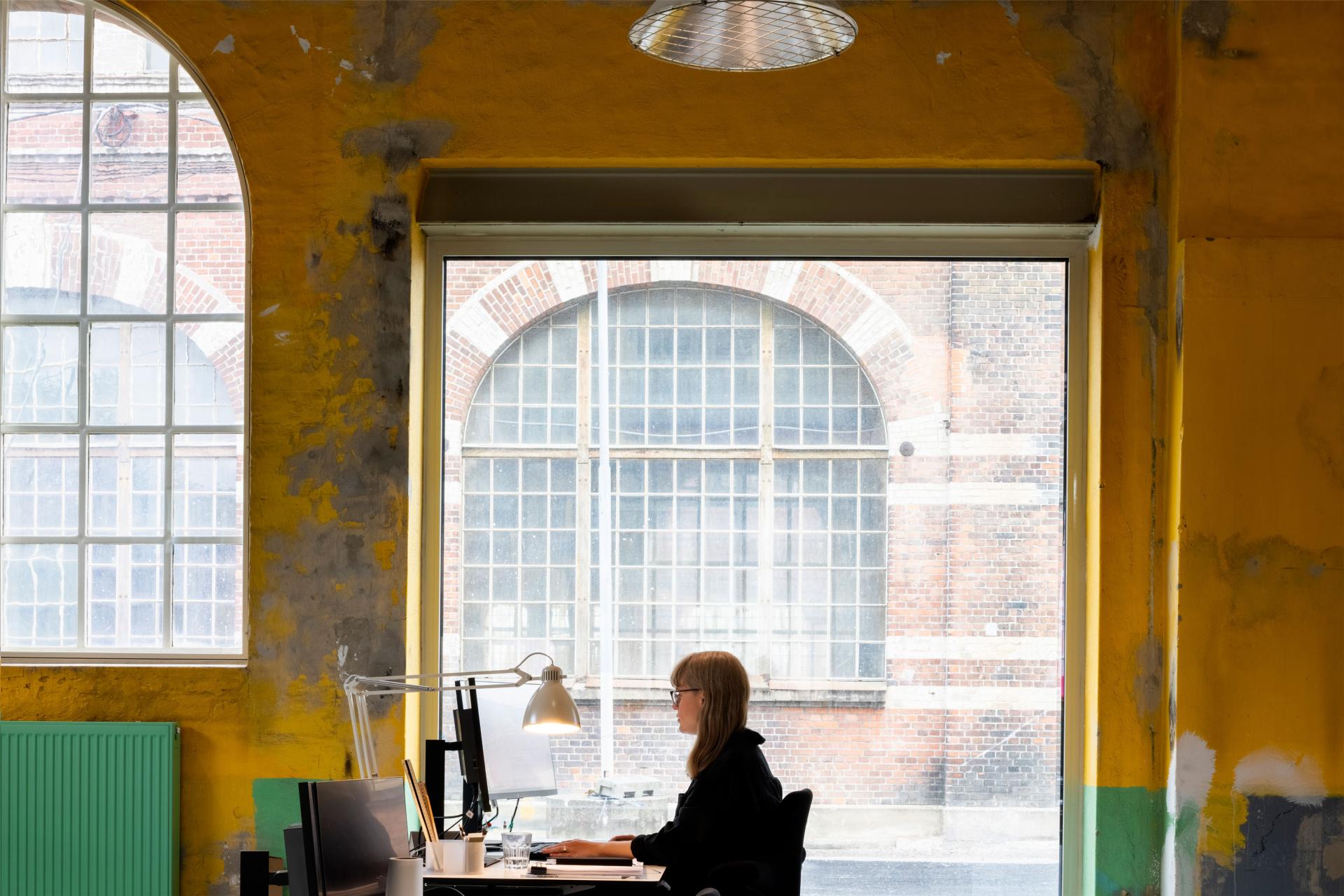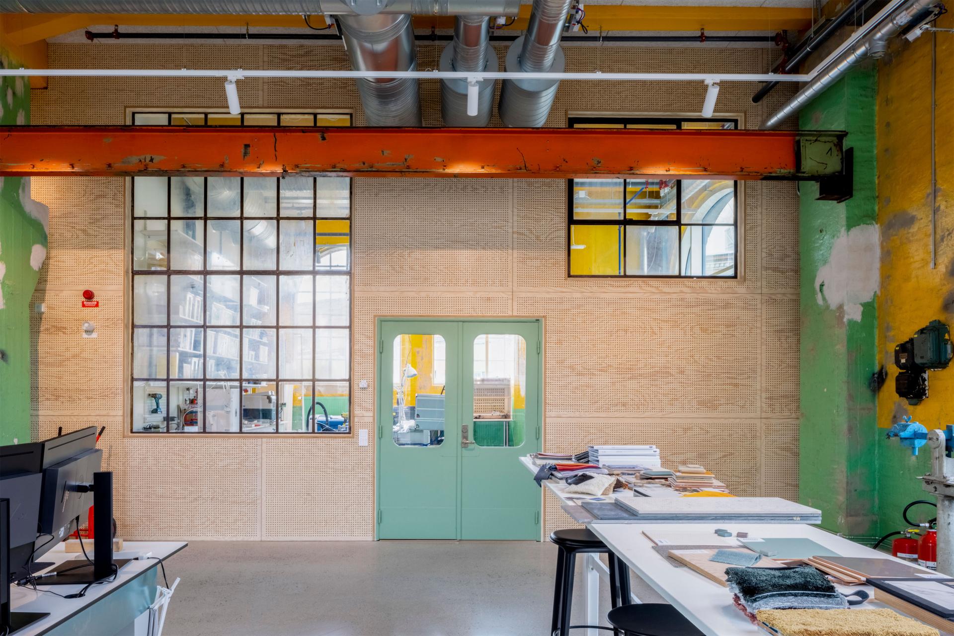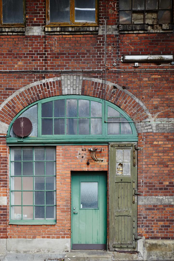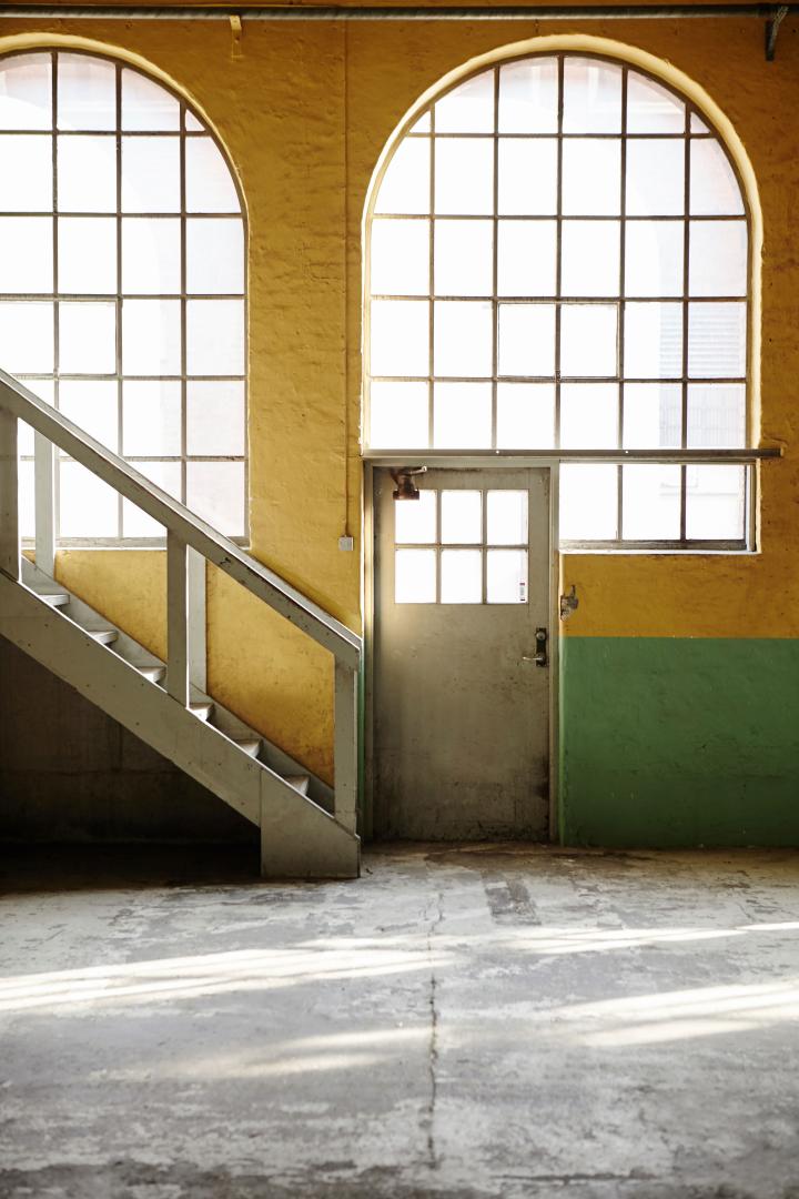 Here are now unique, recycled steel stairs, beautiful industrial windows, interior doors and large workshop luminaires. Brick has been reused as a facade in the Orangery, an extension that with its rounded corners distinguishes the extension from the straight and rational shape of the original warehouse building. Colors were also inventoried early in the project. The green and sunny yellow color palette in the building's entrance hall and ground floor also tell a story, while preserving the house's unique character and contrasting with the premises' new content.