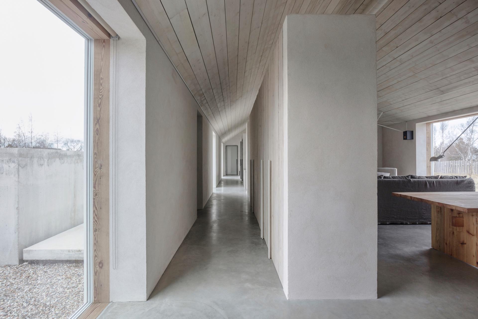 The one-storey house is set in a seaside meadow as a simple elongated volume that draws a thin straight seawave-like line in the surrounding undulating landscape, leaving as small an imprint in the existing biotope as possible.